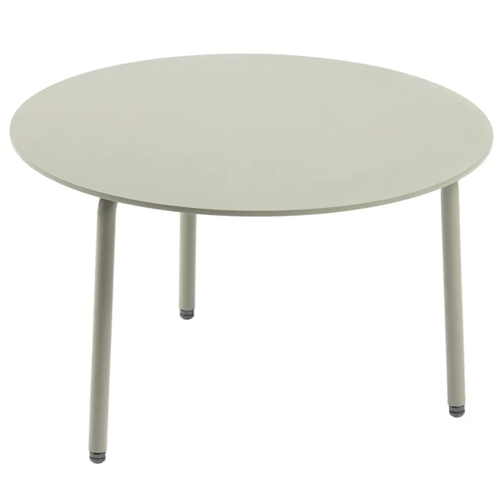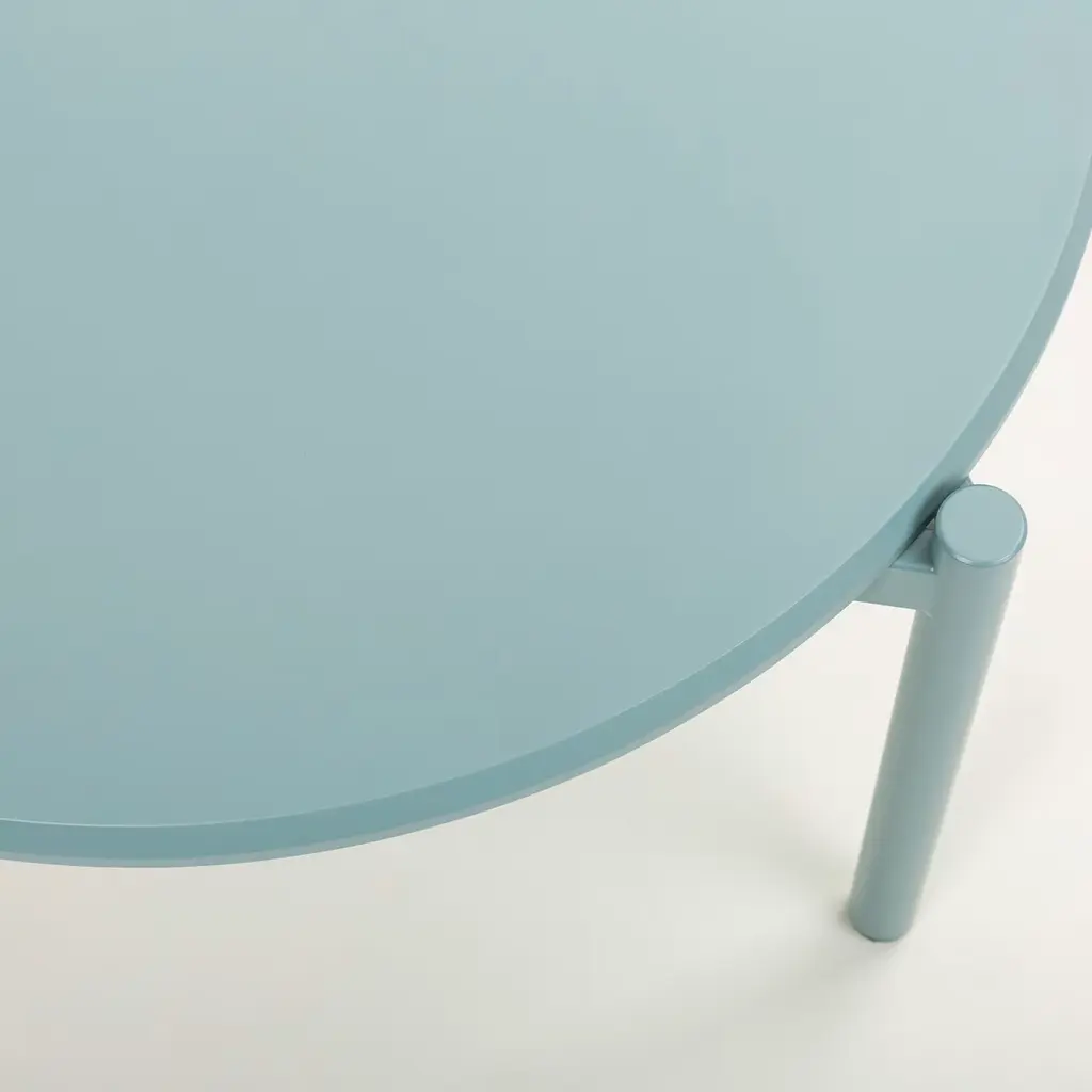 This round coffee table features a light blue MDF varnished top with a matching steel tubular structure. Adjustable rubber feet.