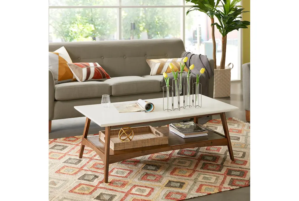 The Blaire Coffee Table with Storage is a mid-century modern style table made of a rubber wood frame, MDF top, and oak veneer shelf, featuring both storage and shelves. Assembly is required for this white and pecan finished table, perfect for any living room. Shop coffee tables like this one and find the perfect design for your space.