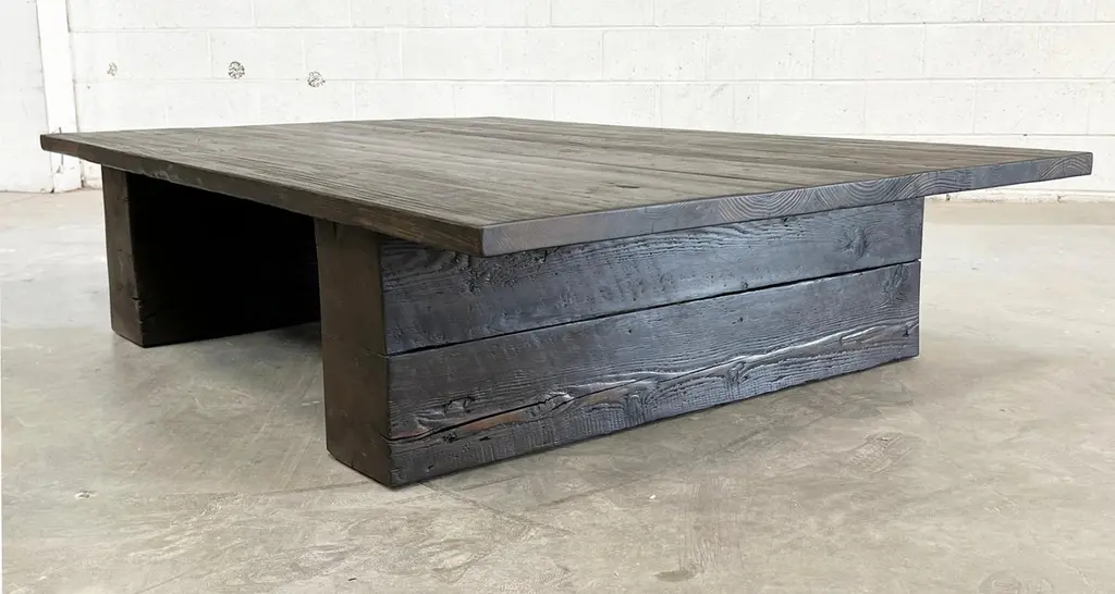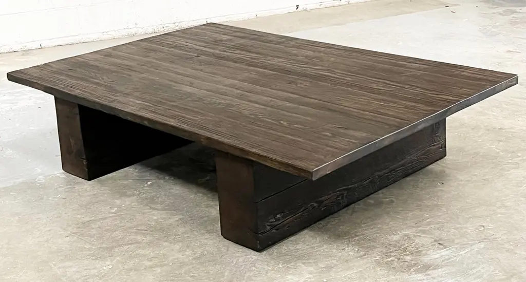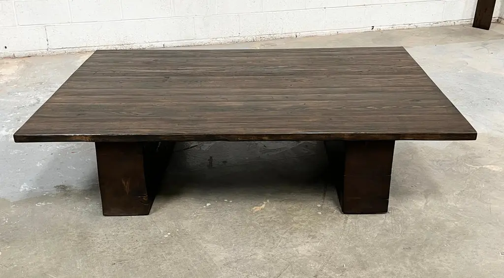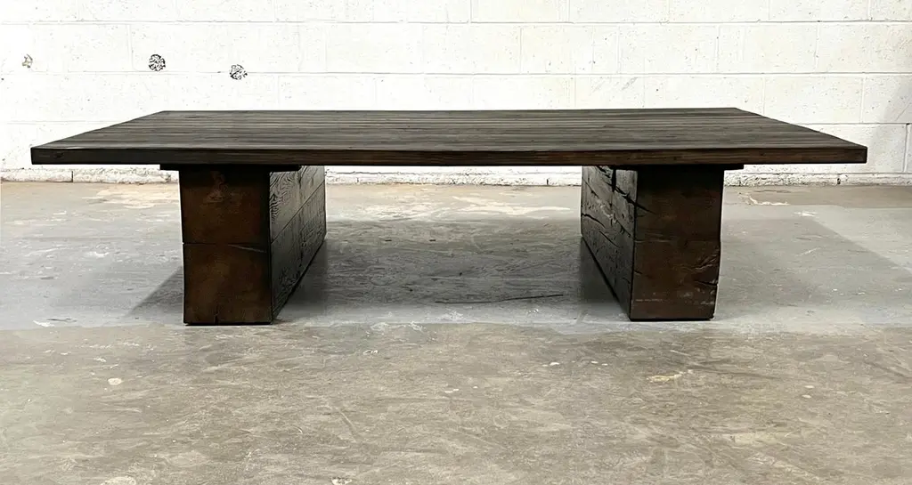 This coffee table is seen here in 62″ x 48″, but can be ordered in any size. The top is made from reclaimed pine planks, and the base from reclaimed pine beams.Each table is bench-made in our Los Angeles workshop using traditional traditional carpentry techniques, no nails or metal fasteners of any kind, just mortise and tenon construction reinforced with hand-cut wooden dowels. Because each table is made to order you can influence all aspects of design, including size, wood species and finish.