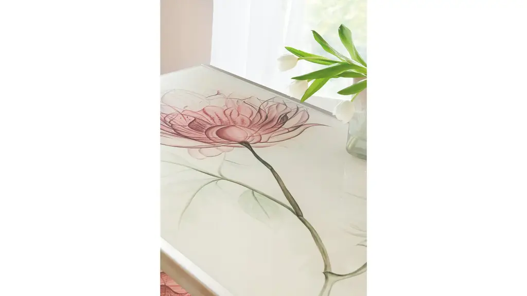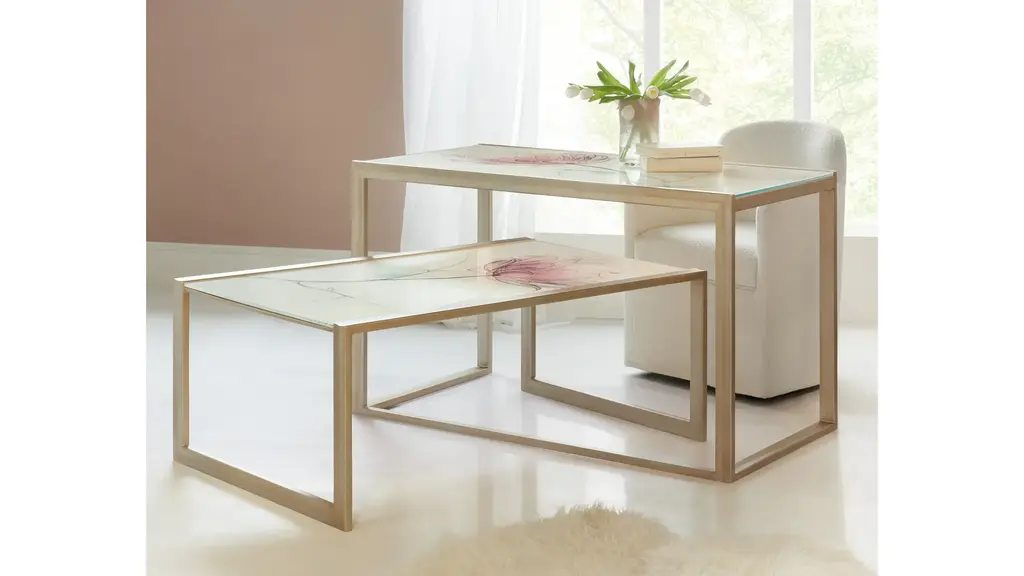 The Blossoming Hope Cocktail Table has a clean silhouette with gold painted metal legs and frame and a tempered Ultra White glass top with hand painting. The reverse-painted glass has a sweeping floral design in pink and green hues over the white background. Measures 32 inches wide by 32 inches deep.
