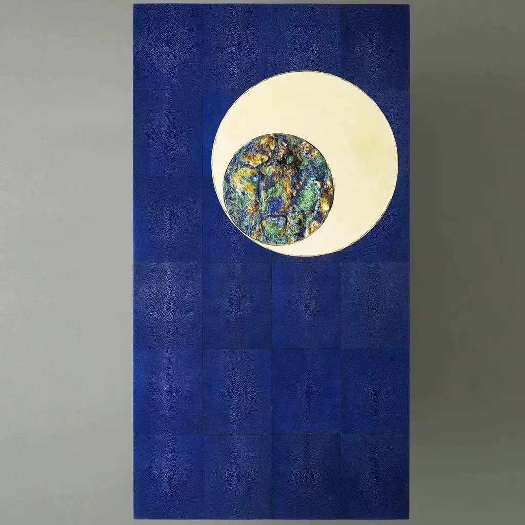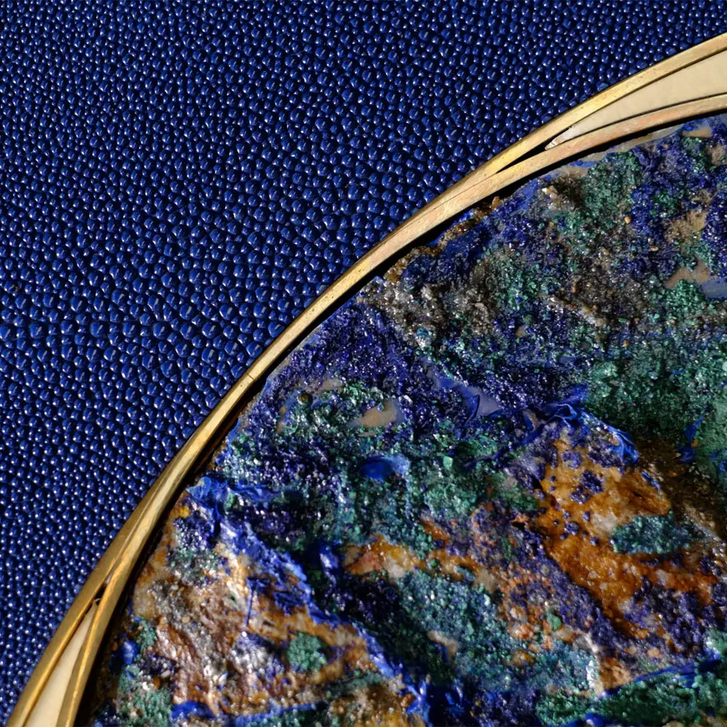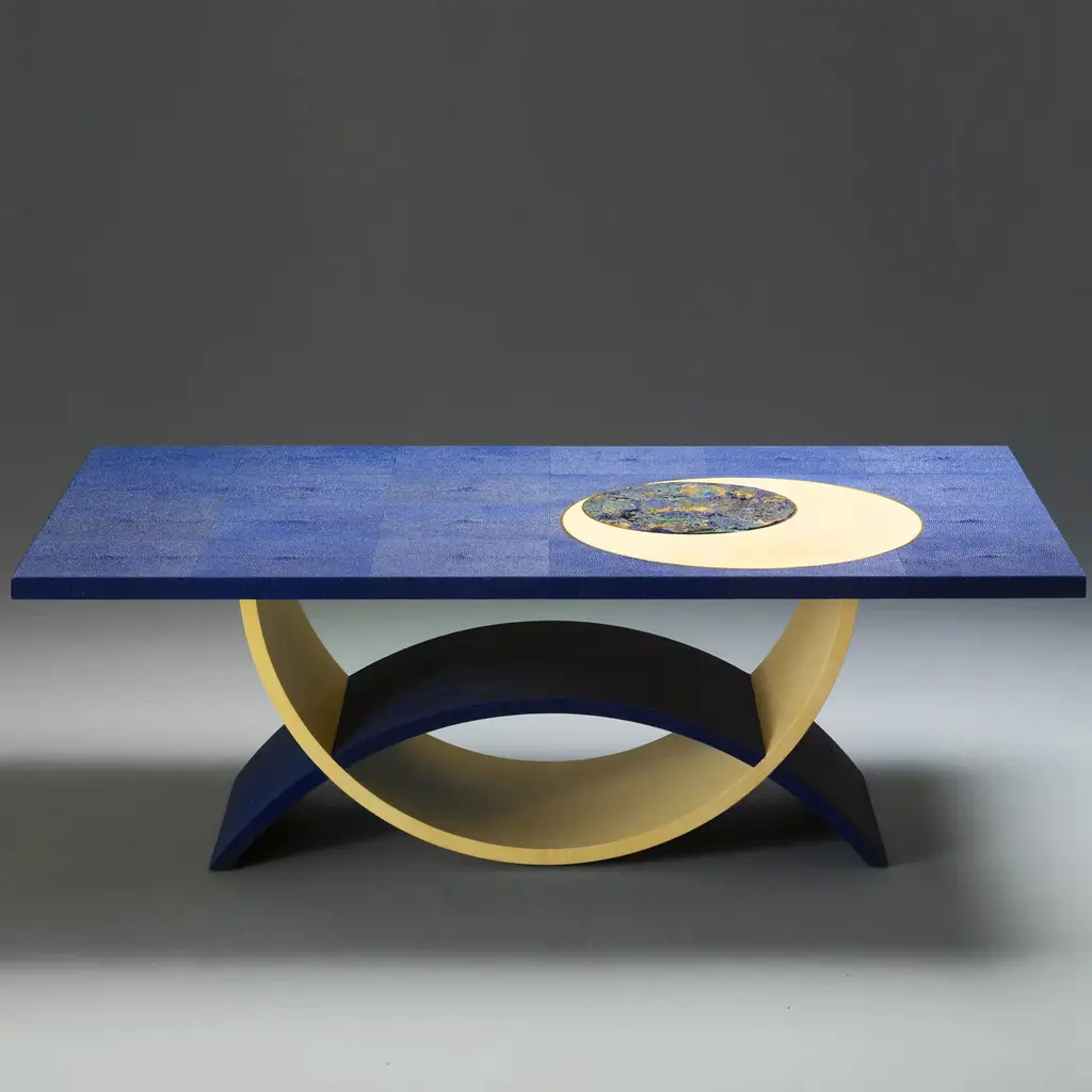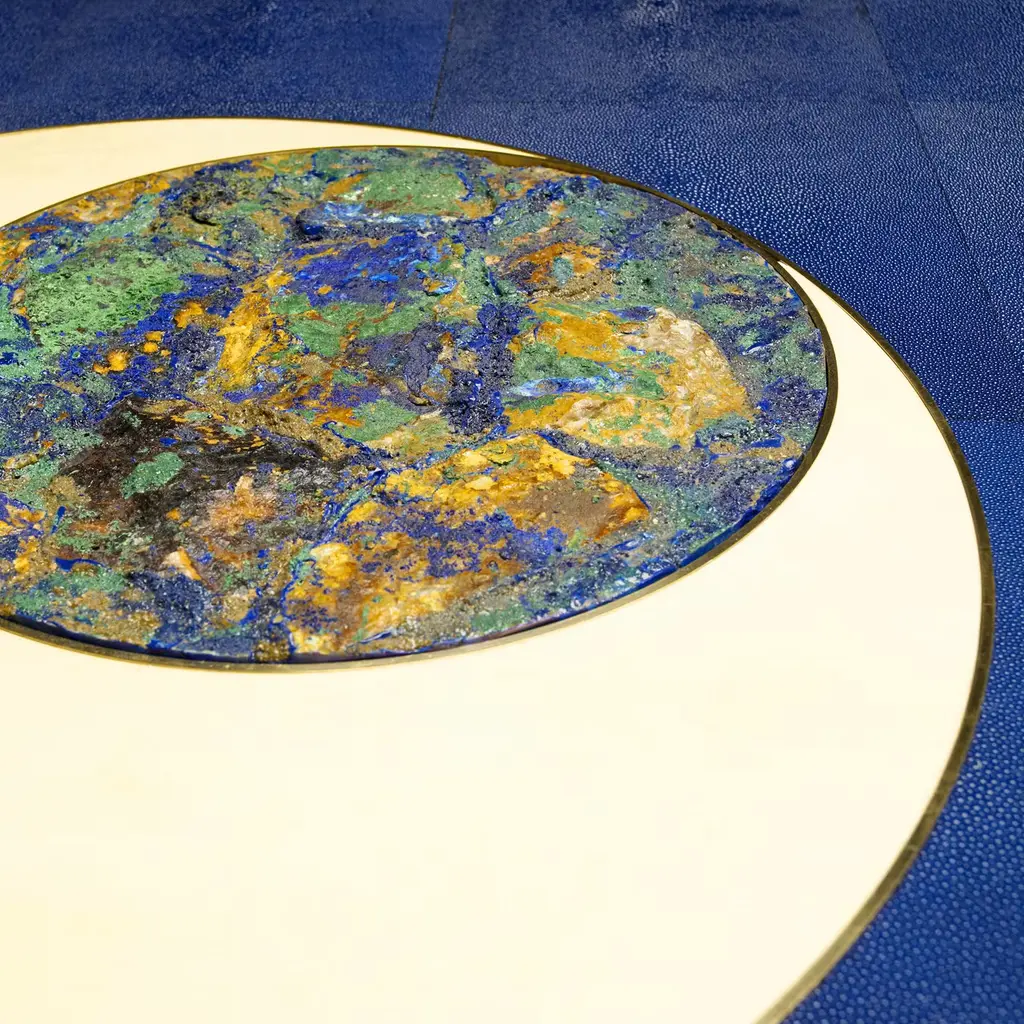 This striking living room table features a top upholstered in blue shagreen (with its distinctive rough texture). The top is embellished with a round insert in azurite stone within a larger round in parchment whose outer profile is highlighted with a brass ring. The base consists in two crossing semicircles featuring the same colors as the top. Design by Teresa Luni.
