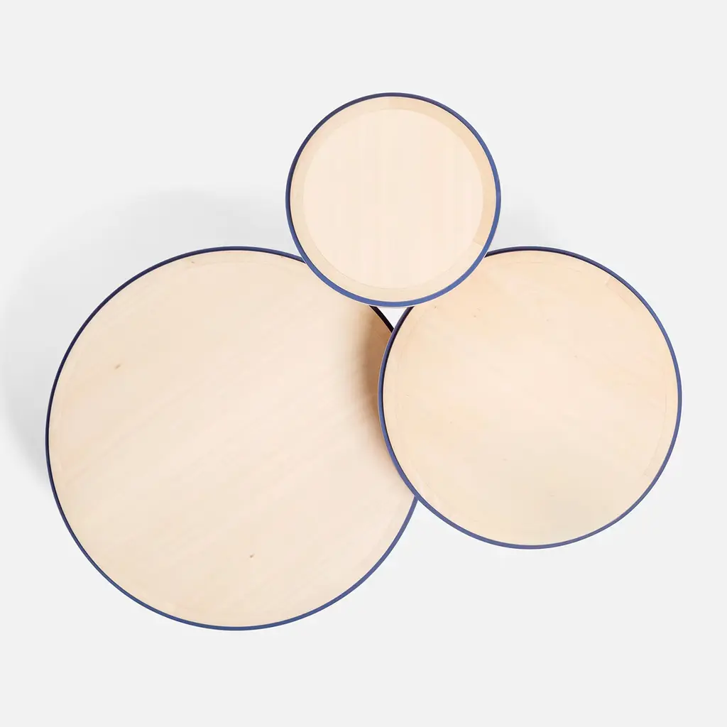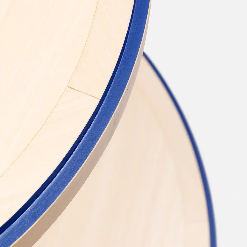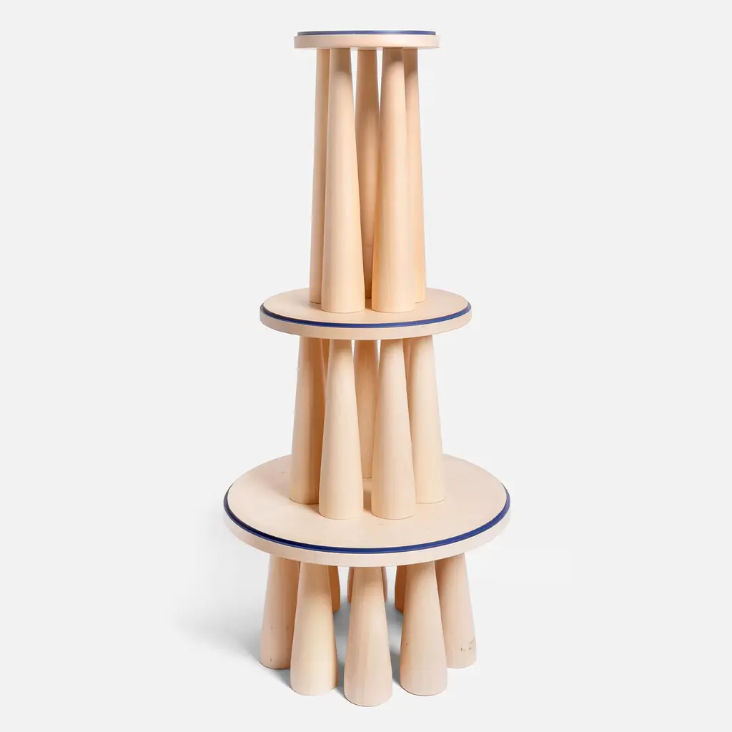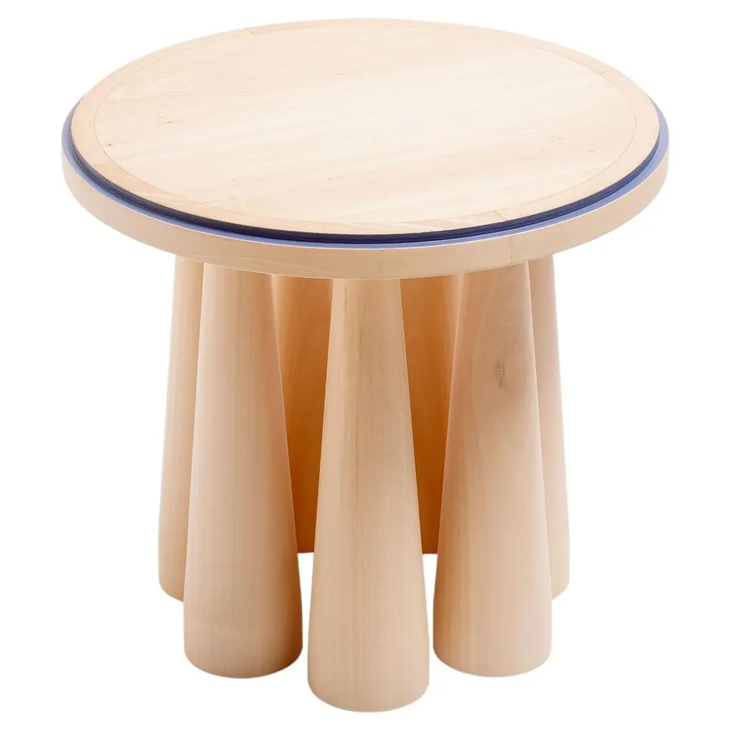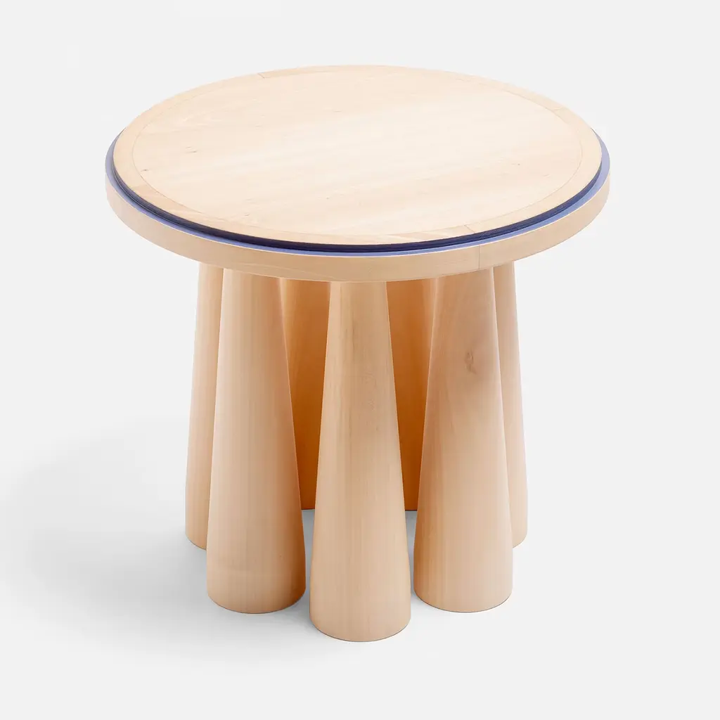The Bogdan collection is born from a single trunk of linden wood, an entire family generated by one specific element. A mono-materic piece of furniture, characterized only by a distinguished color line that defines its perimeter and shape. The cones at the base, arranged in a circle to create a single visual element, support the top that is configured as the unifying part of what raises it. The colored milled-edge ribs, embellish and complete the top, creating plays of chiaroscuro all around.