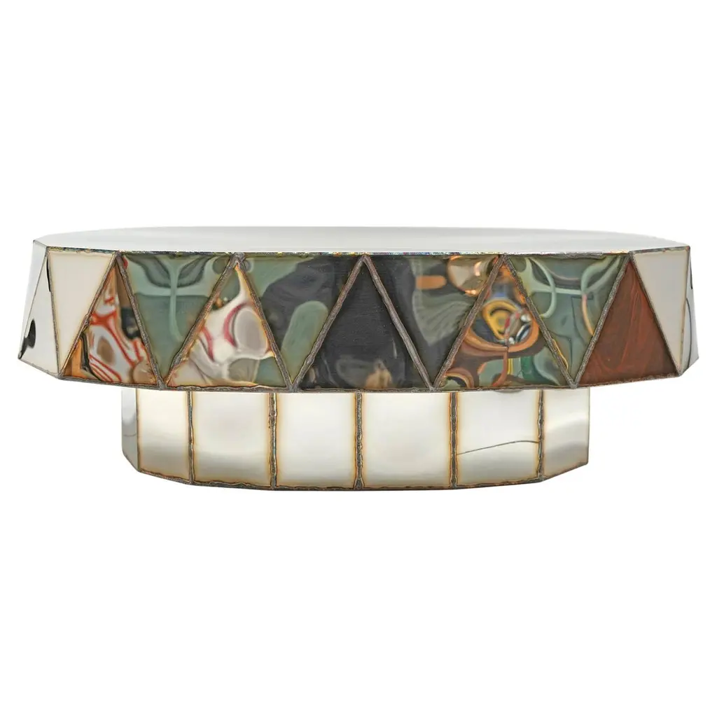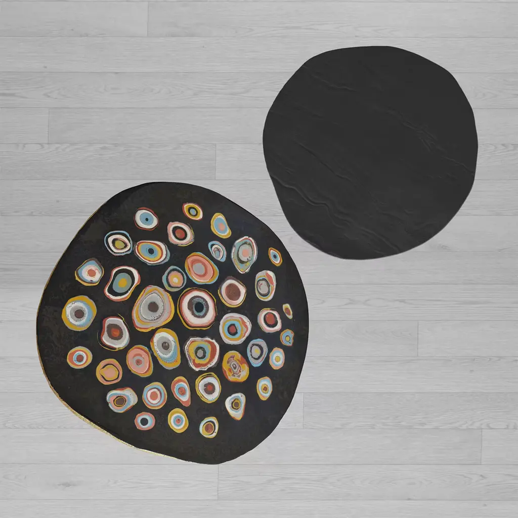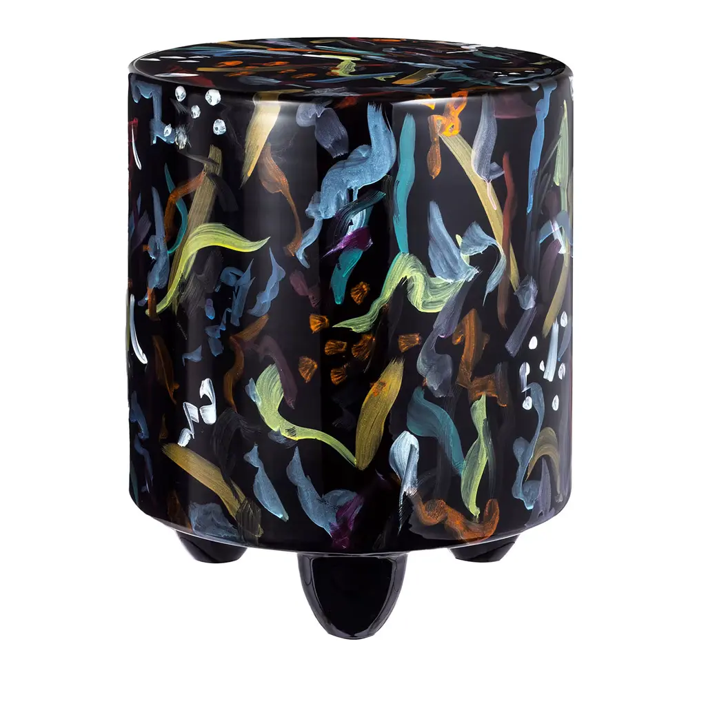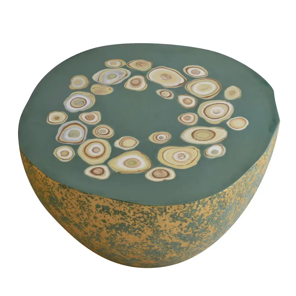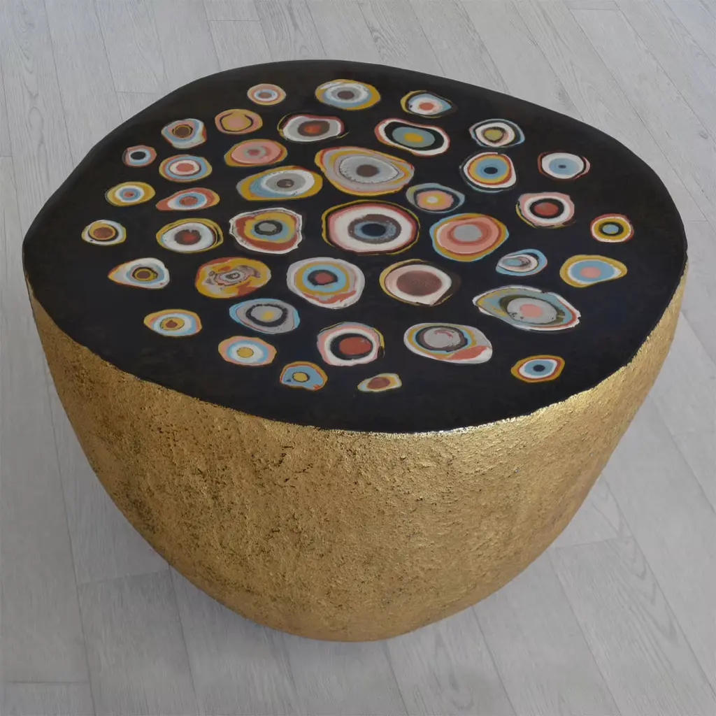 Brimming with the allure of an objet d'art, this coffee table from the BonBon Collection is an ode to the spontaneous elegance of irregular profiles enlivened by vibrant and eccentric patterns. A warm golden tone accents the coarse sides, while the black top hypnotizes with its colorful dots reminiscent of precious murrinas from Murano glass artworks. Every piece is carefully handmade and unrepeatable.