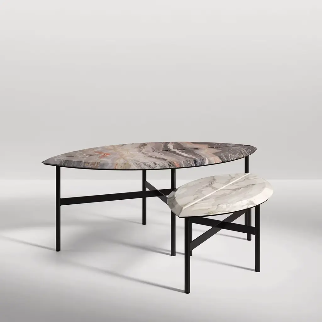 The Book 1 & 2 Coffee Tables by Artefatto Design Studio are inspired by the natural elegance of giant leaves. Book 1 features a Standard Arabescato Orobico marble top, while Book 2 showcases a Premium Calacatta marble top, with intricate vein patterns mimicking those of real leaves. Both tables are supported by a sleek Jet Black metal lacquered structure, adding a contemporary touch. Available in various marbles and finishes, theys serve as focal points in any modern space.