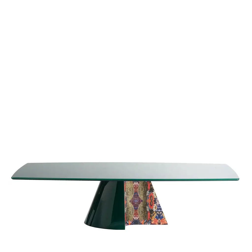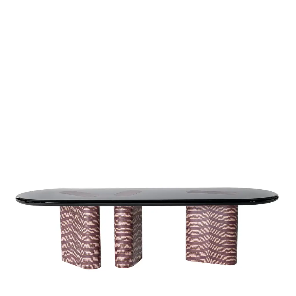 A distinctive design from the Boomerang Collection of furniture items, this gorgeous coffee table exudes a sophisticated contemporary allure. Resting on extra-clear Plexiglas feet decorated with a mesmerizing color gradient lacquer, it features a multilayered top covered with lacquered MDF, displaying a lively patterned decoration.