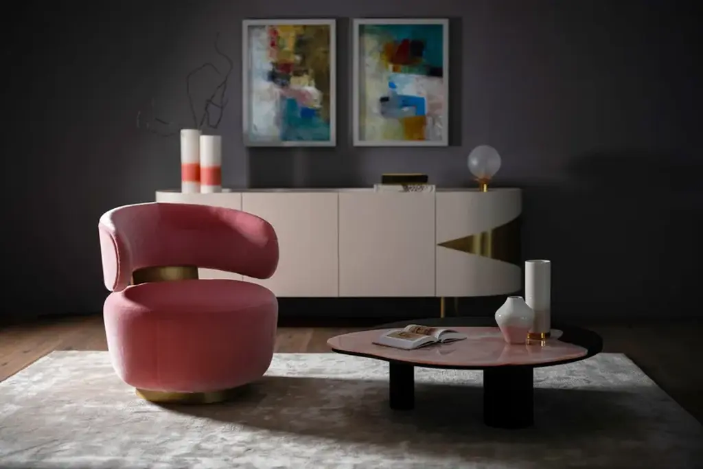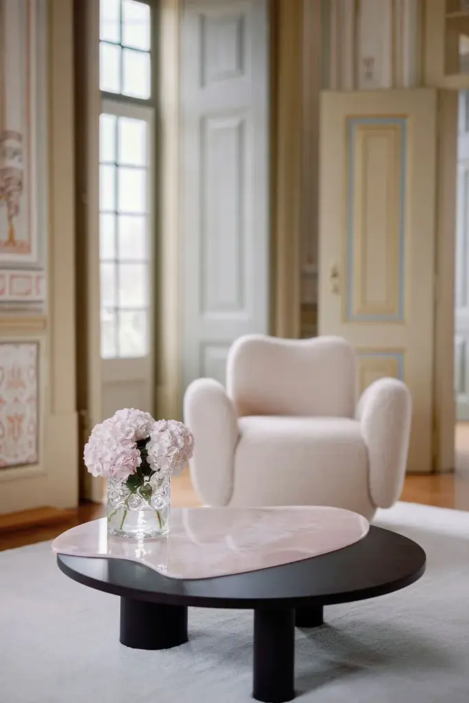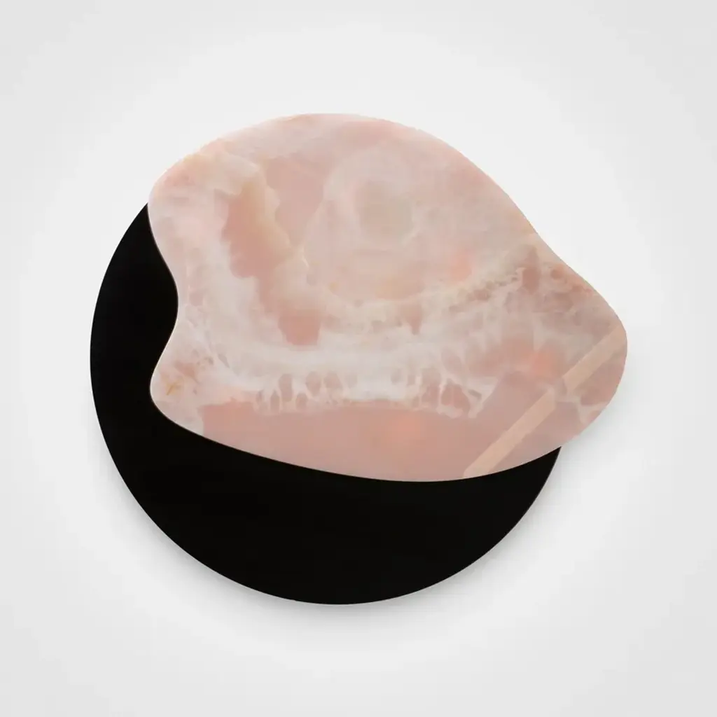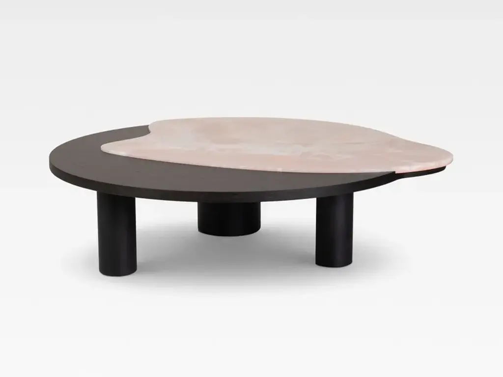 Bordeira is a coffee table. Inspired by the lines of the beautiful Bordeira beach, this low table adds a representation of our earth’s visual history to every living space. Its organic, flowing form creates a stunning combination between the lush Pink Onyx and the black-stained American oak.Materials & FinishesWD107 American oak; open-pore black stained; matt finishWD110 Beech; black stained; matt finishST058 Pink onyx; polishedInspired by the lines of the beautiful Bordeira beach, these low tables add a representation of earth’s visual history to every living space. Its organic, flowing form creates a stunning combination between the lush stone texture of the marble and the black stained American oak or the white oyster laquering.