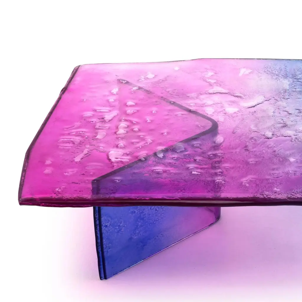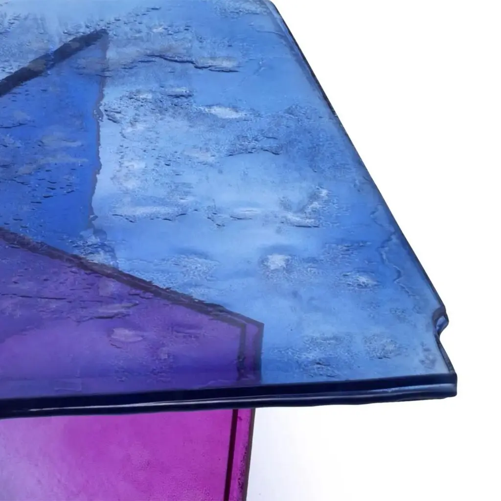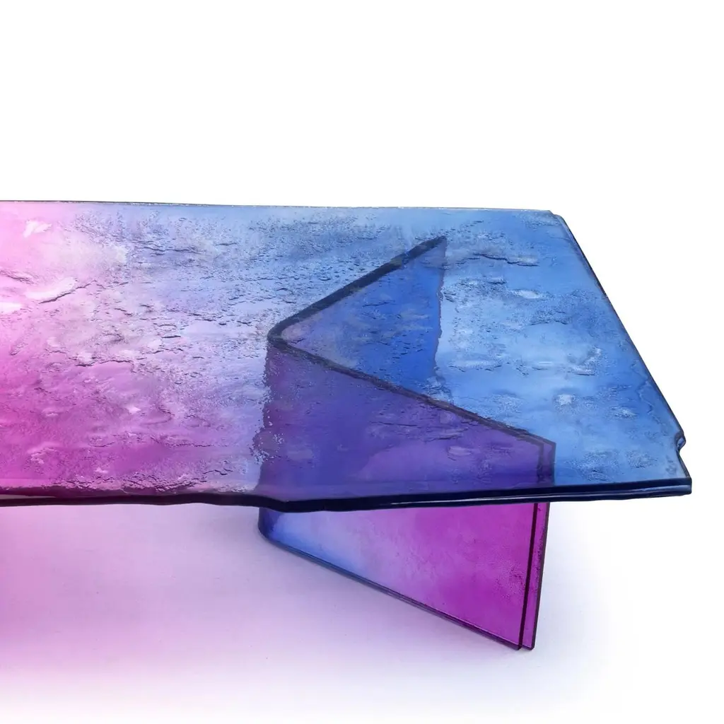 Coffee Table Borealis with legs and top in baked glass in two layers. Table top with irregular edges. All the piece is varnished in gradation from blue to pink, with smoothpartial silvering on the back.