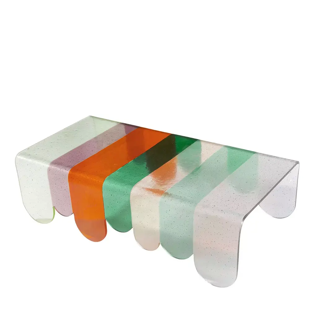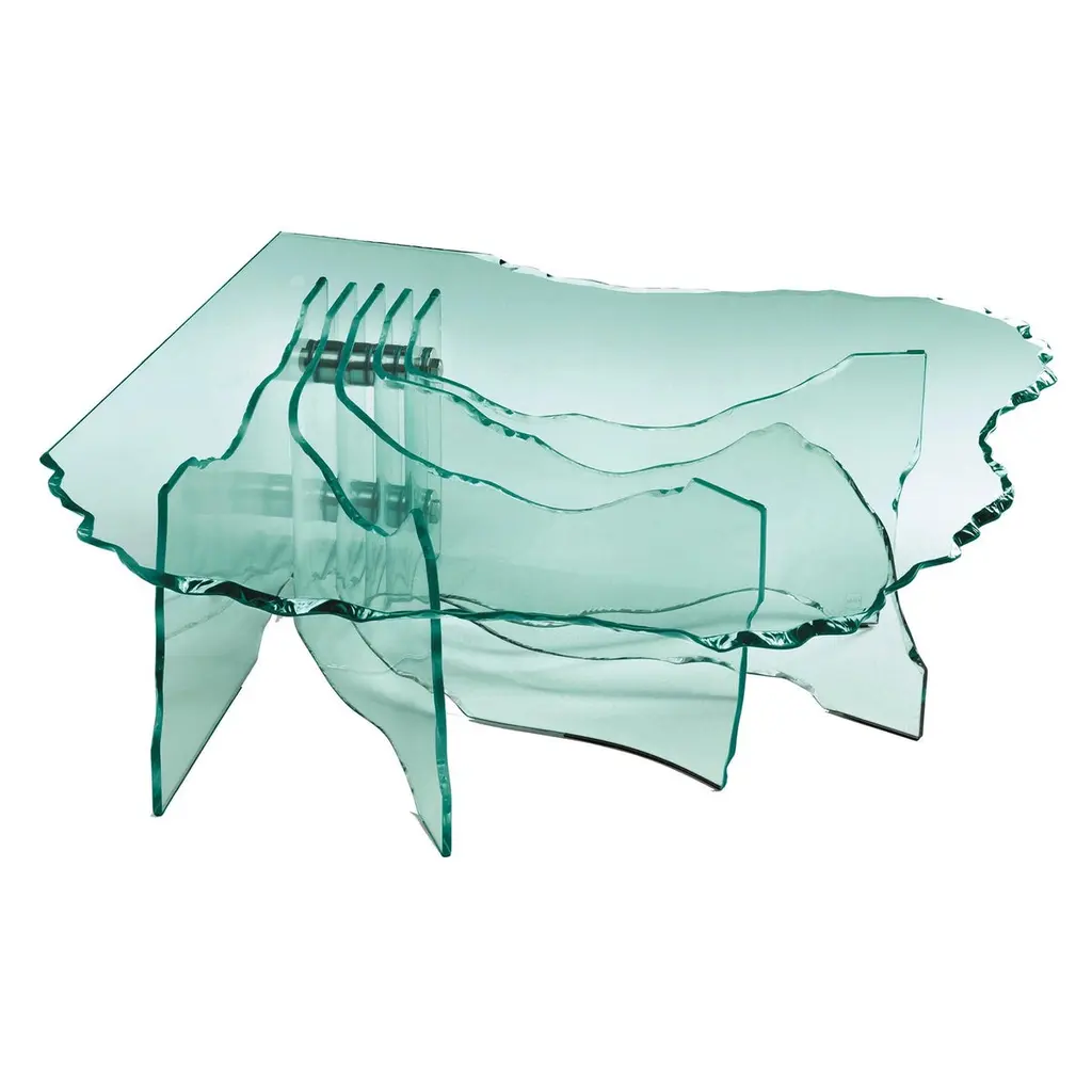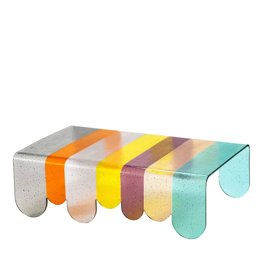 Coffee Table Borealis with legs and top in baked glass in two layers. Table top with irregular edges. All the piece is varnished in gradation from blue to pink, with smoothpartial silvering on the back.