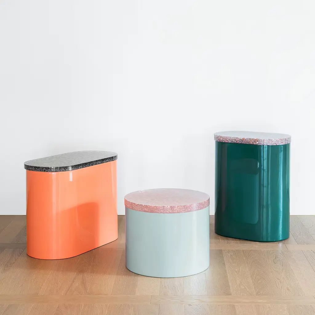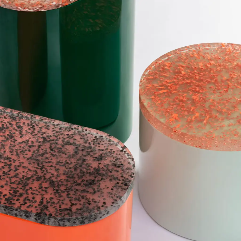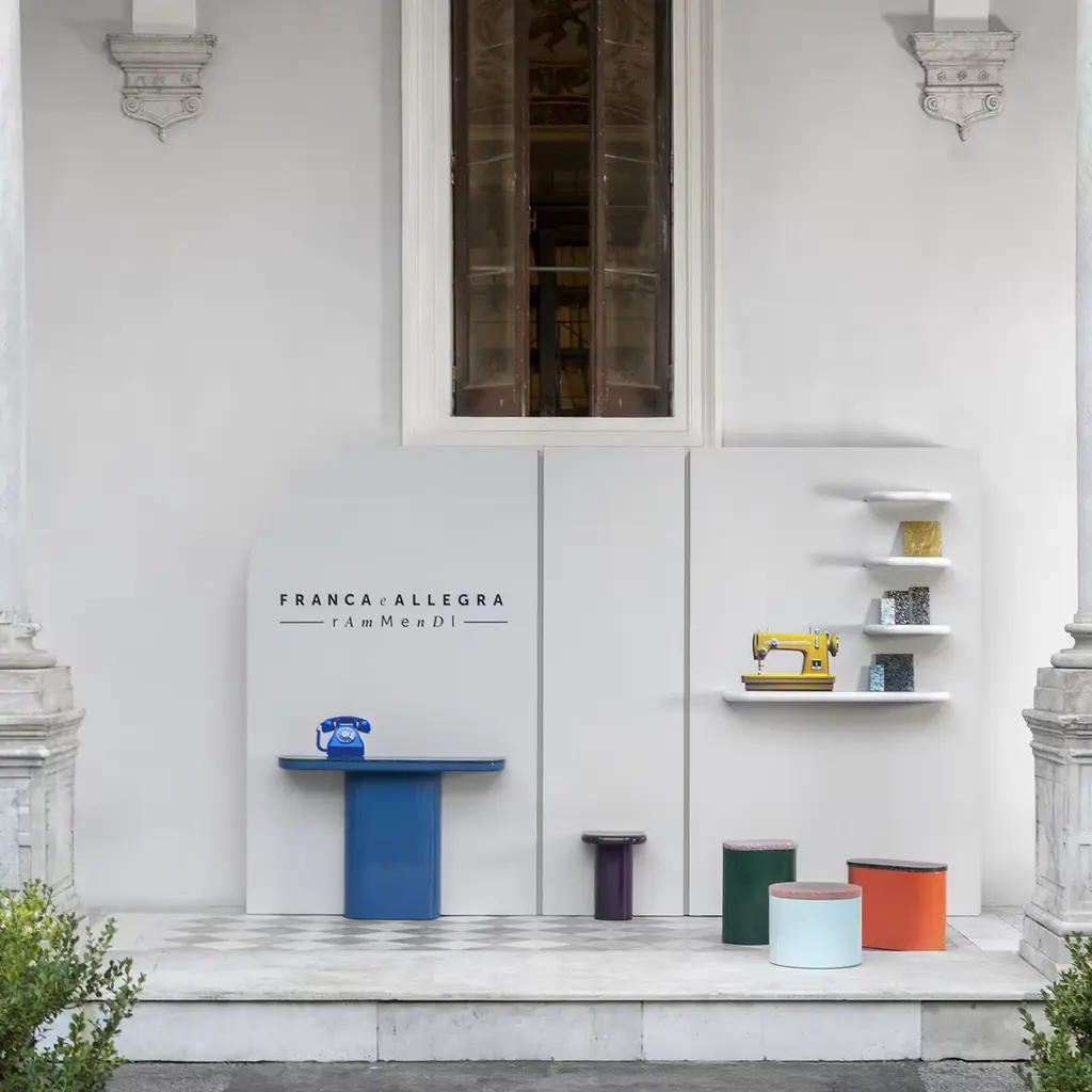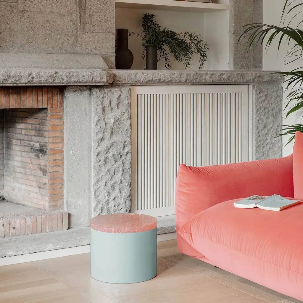 The Bottone light blue coffee table is a striking addition to contemporary living spaces, showcasing a unique blend of sustainability and style. Crafted with a super glossy lacquered MDF structure, this table features a top made from 100% recycled polystyrene, part of the eco-conscious "Glass" series by Plastiz®. Designed with a nod to sustainability, the Bottone is part of the "Franca e Allegra -Rammendi-" collection, creatively repurposing materials to form an elegant and functional piece. The collection embodies a philosophy of mending and storytelling, reminiscent of traditional craftsmanship that values resourcefulness and creativity. This coffee table is perfectly sized for versatile use in any room. It serves not just as a coffee table but also as a decorative accent that conveys a narrative of renewal and ecological responsibility. Embrace a modern aesthetic while contributing to a sustainable future.