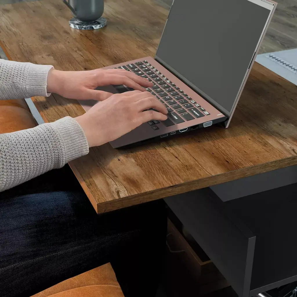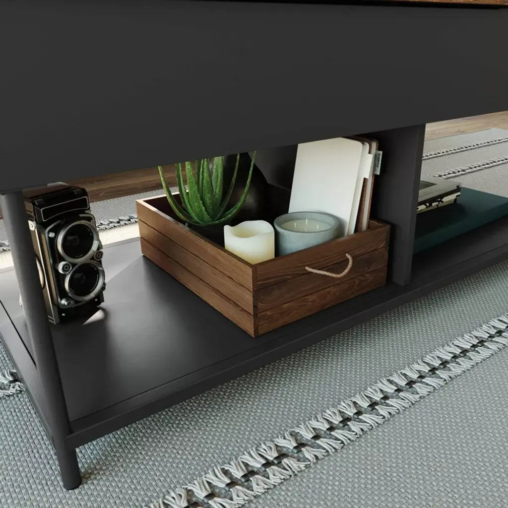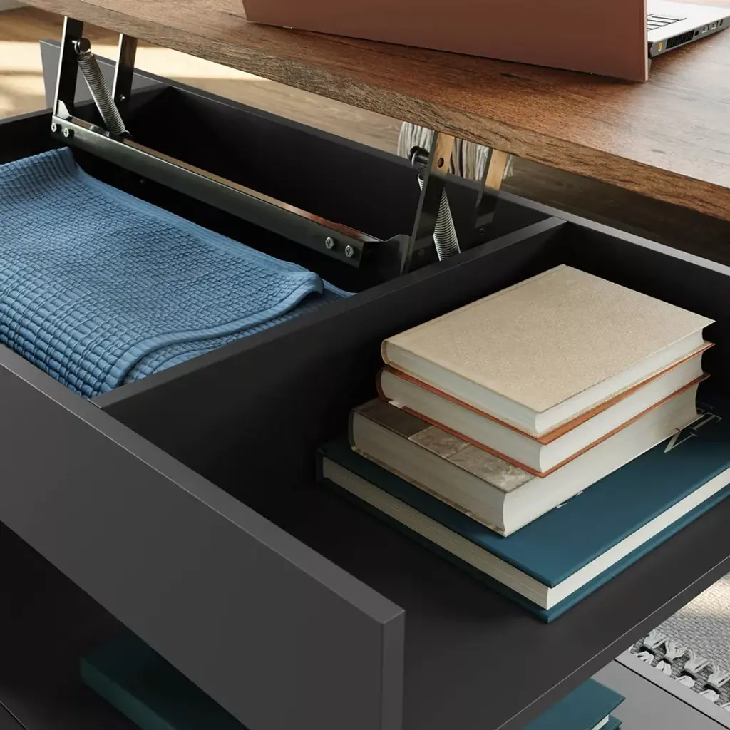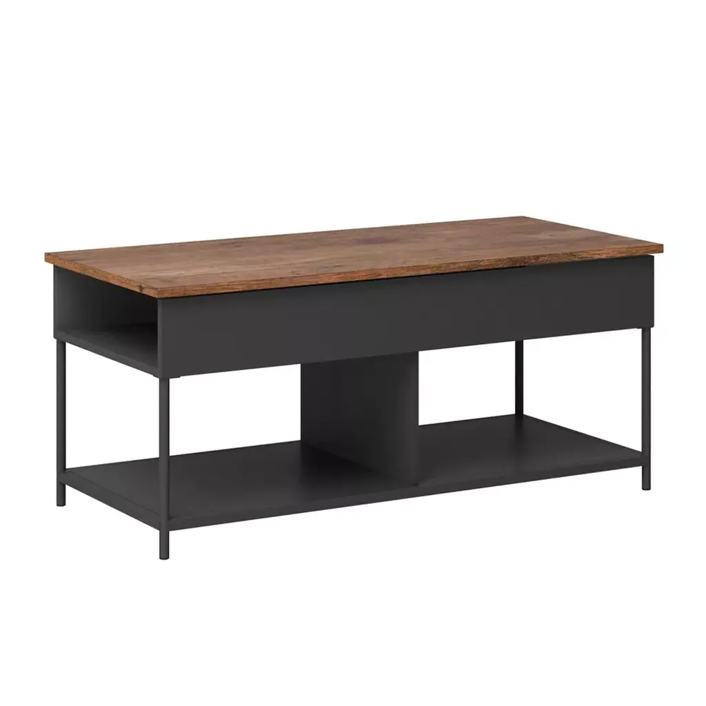 A lift-top coffee table transforms a living room from a passive place of relaxation to an active space where memories are made around the coffee table. This lift-top coffee table from the Boulevard Café collection will convert your living room or den into one of those magical, memory-making spaces. This table with storage features a top that lifts up and forward to create a versatile work surface for activities like snacking or playing board games. A divided area underneath the top of this wood lift top coffee table is the perfect hidden storage space for items like remotes, instruction booklets, and more. Open side access for additional storage beneath the lift top of this pop-up coffee table holds books, magazines, collectibles, and more. A lower additional shelf for storage and display of blankets or organizing bins is another multifunctional feature of this table with storage. Finished on all sides for versatile placement in any room of your home, this wood top coffee table looks great from every angle. With a durable, powder coated metal frame with a Black finish and Vintage Oak® accents, this coffee table with lift-top has enough features to impress anyone, and it looks good doing it.