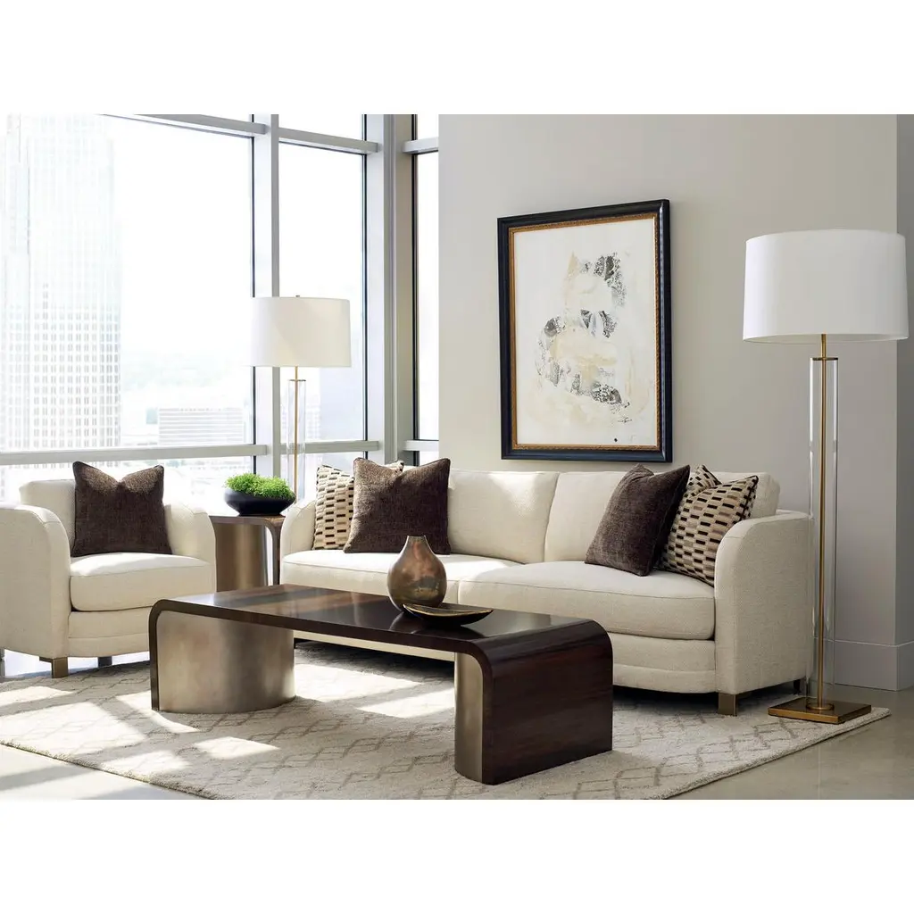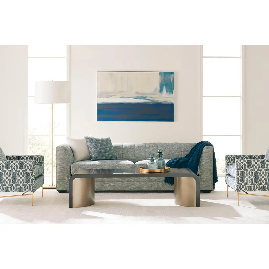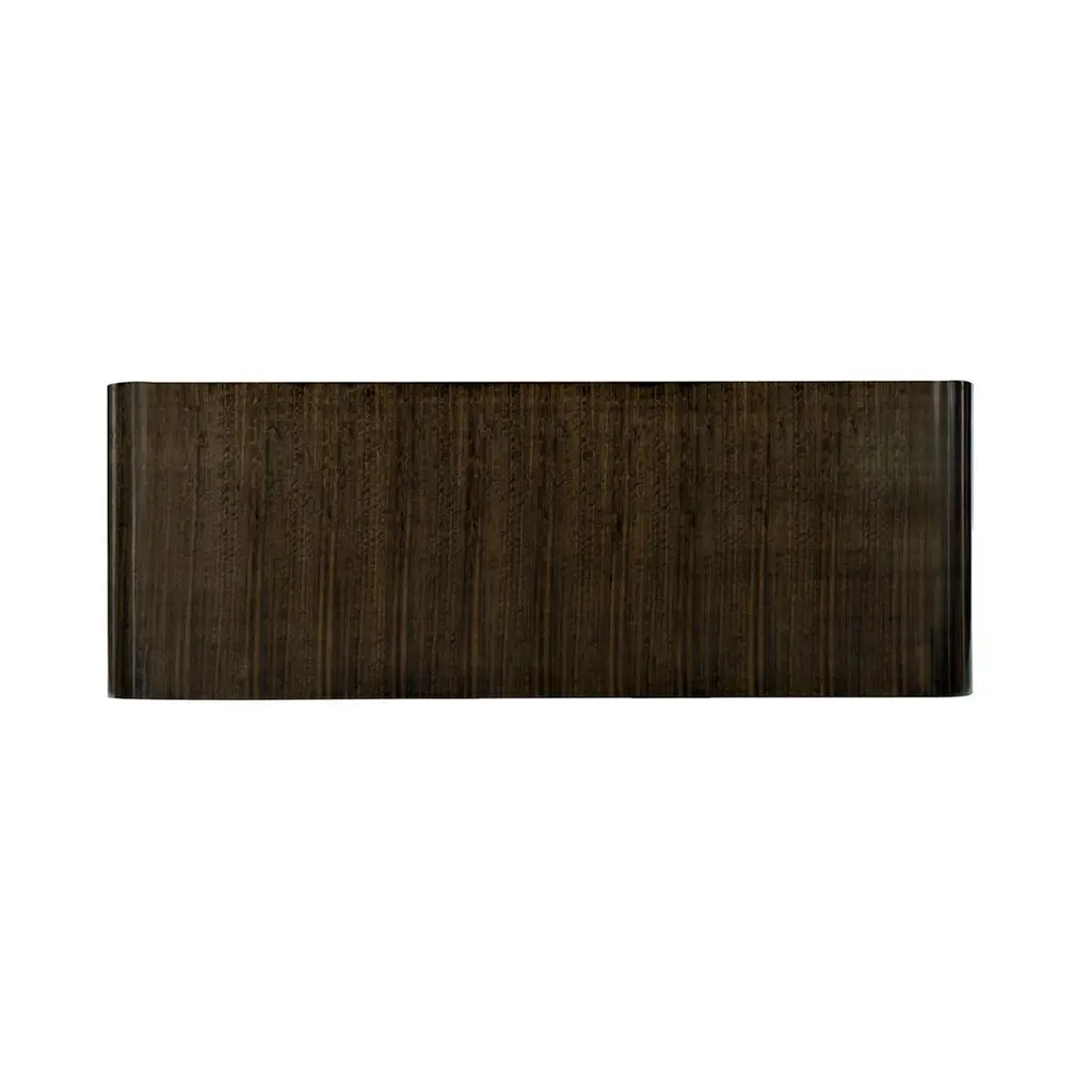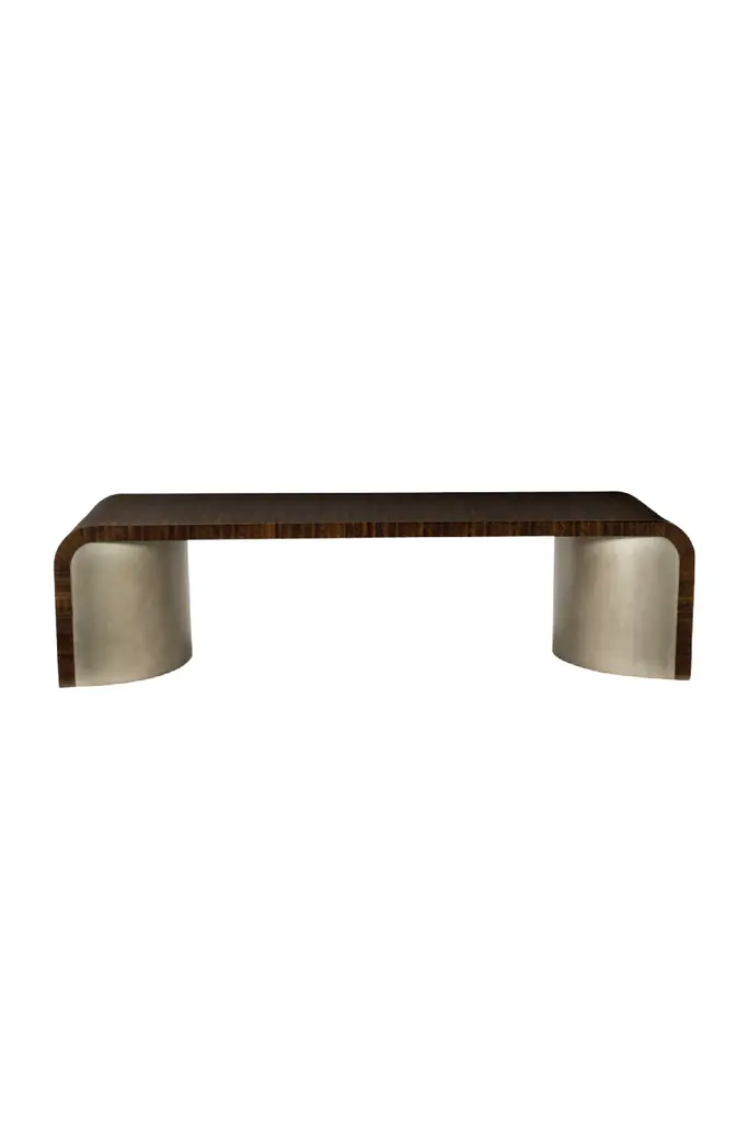 Fumed figured eucalyptus wood, finished to a high sheen in luscious Aged Bourbon, wraps the top of this rectangular table that is void of sharp angles. Two large, half-moon-shaped pedestals support the piece and are covered in Smoked Bronze. The smooth, elegant curves of this cocktail table will not be forgotten.Dimensions: 66" W x 24" D x 17" H