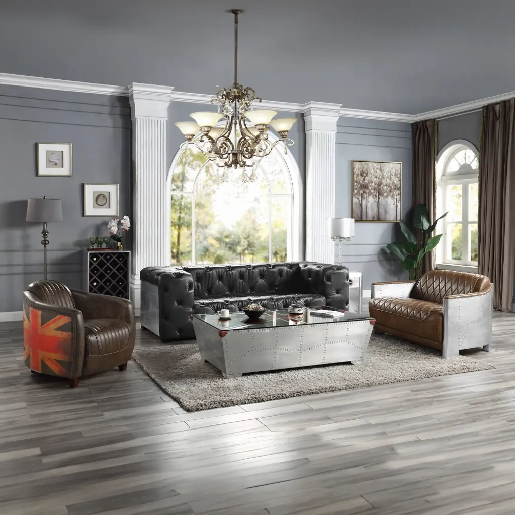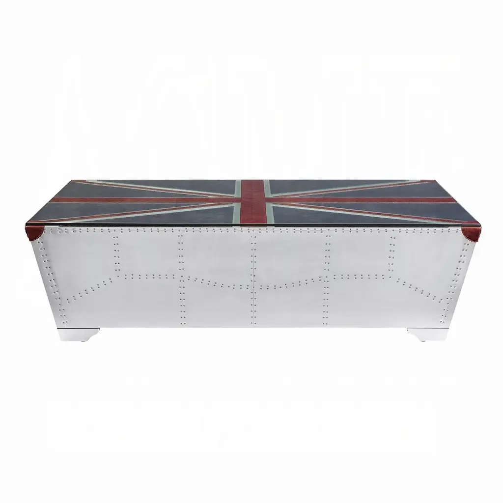 Our famous Brancaster collection now includes a Union Jack-printed coffee table. It is constructed with high-quality aluminum that will last for years of use. The tabletop print on this coffee table is protected by the clear glass top, which also makes for easy cleanup and maintenance—it is adorned with rivets throughout the frame for an industrial edge making this a modern, eye-catching piece in any living room.