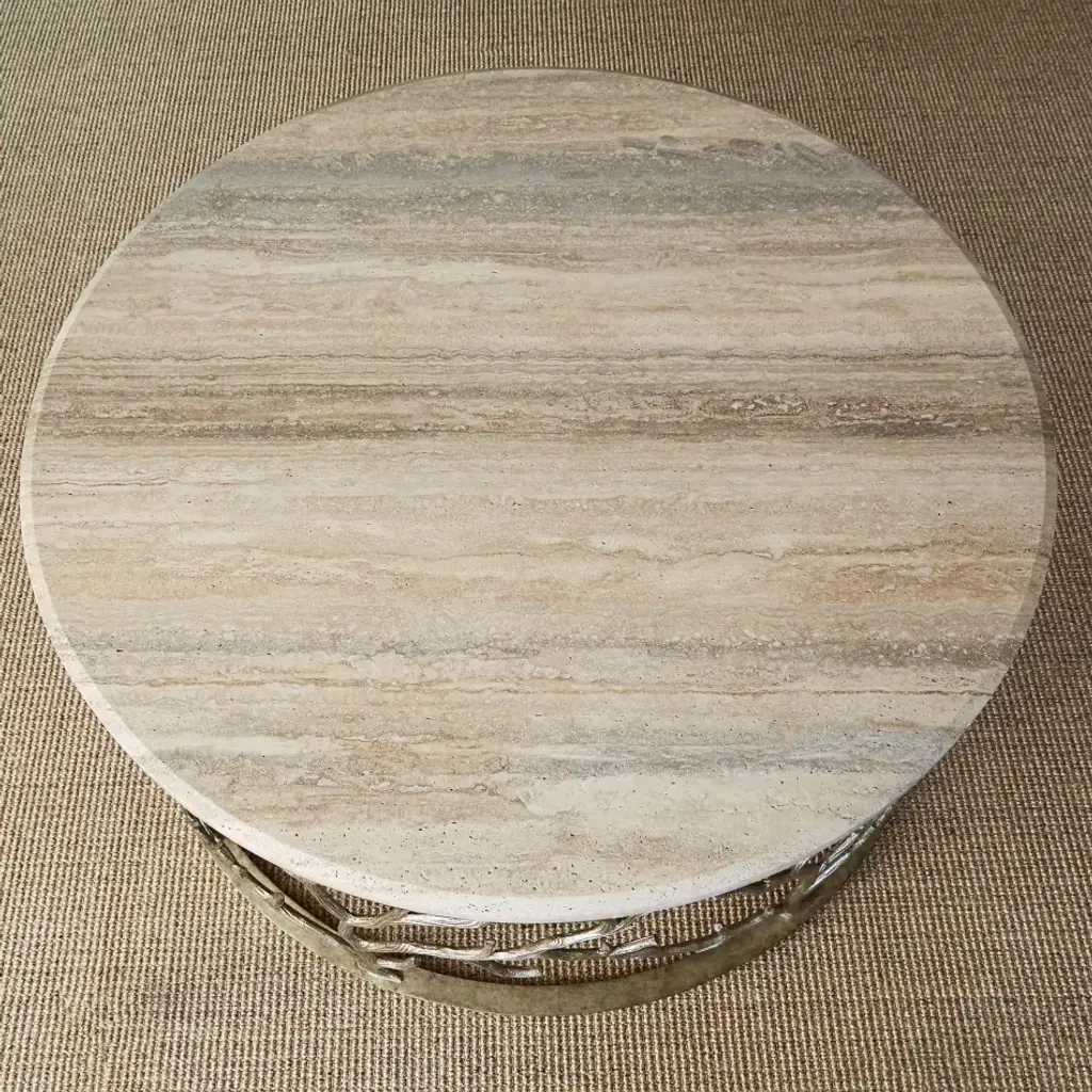 Cast aluminum table has a silver metal leaf finish with golden and green highlights. Top is made of Italian silver Travertine and has a honeycomb steel core that reduces weight and improves strength.
