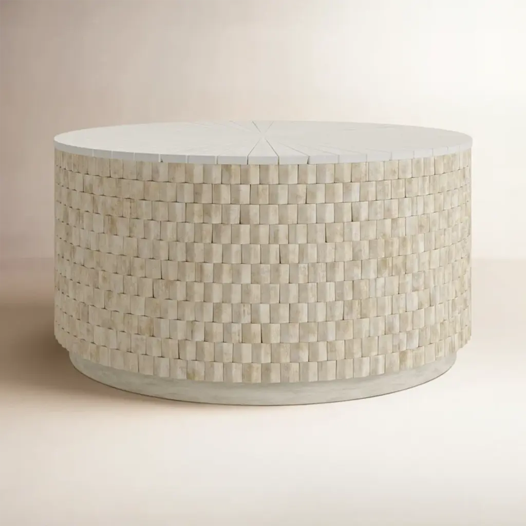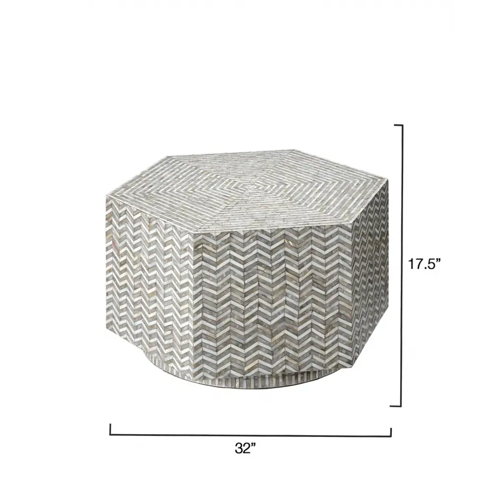 A jewel of the sea, Mother-of Pearl is a natural substance with rich luminescence, and each piece of it is unique. Small, multi-tonal strips of the iridescent material are carefully selected and expertly placed to create the intricate mosaics the cover every inch of these accent tables. Carefully contrasting their opulence with restraint, their geometrical shapes are kept deliberately simple. Place next to a neutral sofa or overstuffed chair to create a unique focal point to your room.