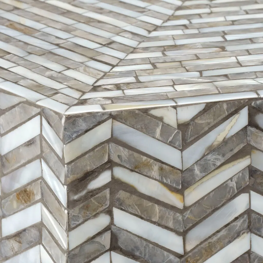 A jewel of the sea, Mother-of-Pearl is a natural substance with rich luminescence, and each piece of it is unique. Small, multi-tonal strips of the iridescent material are carefully selected and expertly placed to create the intricate mosaics that cover every inch of these accent tables.