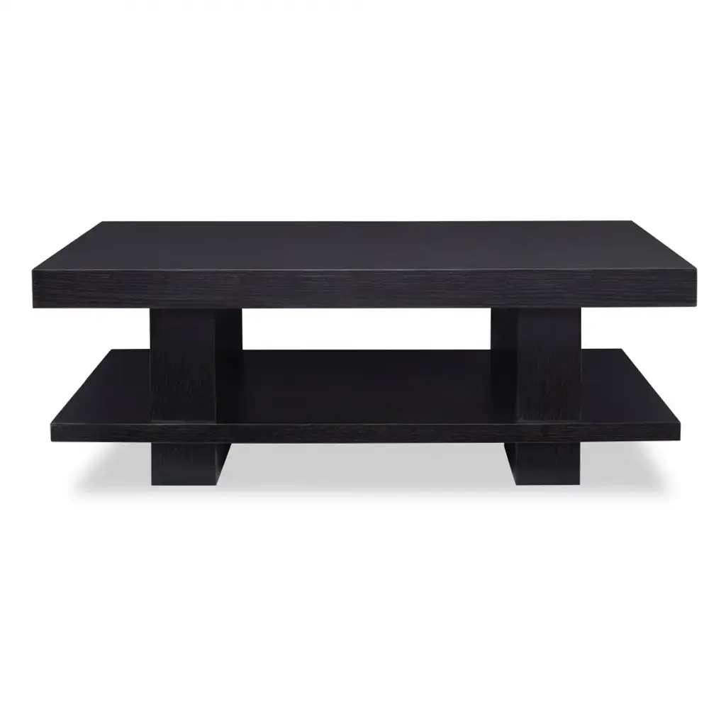 Featuring an architectural demeanor, this Mahogany cocktail table includes a thick slab top raised over two slab legs and one shelf.