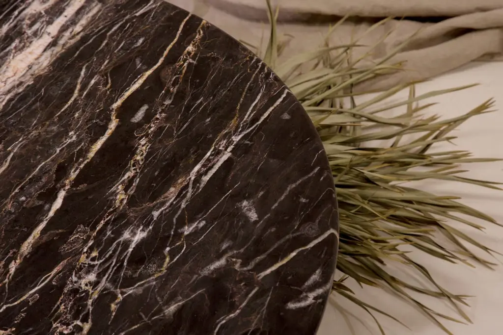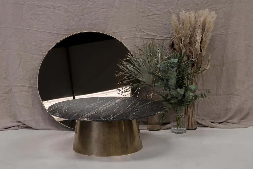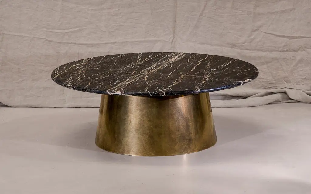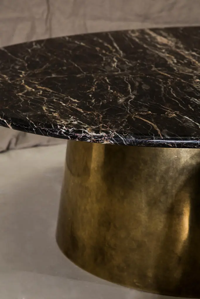 Brass and marble coffee table signed by NovocastrianDimensions: 35 x 100 x 100 cmMaterials: Rare British Marble (subject to availability), base in Patinated BrassEach iteration is a truly unique creation, many of the available marbles will never be quarried again.Handcrafted in the UK. Available in bespoke sizes and finishes. Can be made with steel base.Made to order in 12 weeks.Measures: 120cm (length) x 80cm (width) x 35cm (height).NovocastrianWe are metalworkers, architects, welders, artists, makers, engineers, and designers. We forge bespoke objects and environments. Our Craft is born of industry, of the manufacturing heritage of our home, North East England. Our creations are elemental, they are humble yet timeless. We believe in the honest beauty of raw, modest materials. Metal is our obsession, the backbone of our work. Each and every one of our pieces is handcrafted to order with passion and integrity by Hardy northern souls.We work internationally, delivering the very highest quality of design and workmanship to some of the world's mosthigh—profile clients. We find fascination in the overlooked, the understated, the unappreciated. Our material palette continues to grow and evolve, yet metal and stone will always be the foundations on which we build. Our creations are proud products of their environments, and materiality is an intrinsic component in defining this environment. We celebrate local materials wherever possible. All of our metal finishes are created in-house by our skilled craftspeople. We work also extensively with the very finest Cumbrian slates, sourced from England's Lake District, only 80 miles from our workshop.For the most special pieces, we work with a range of exquisite yet incredibly rare British marbles.