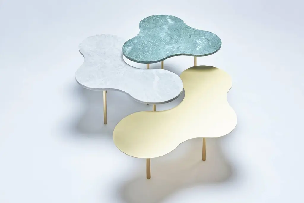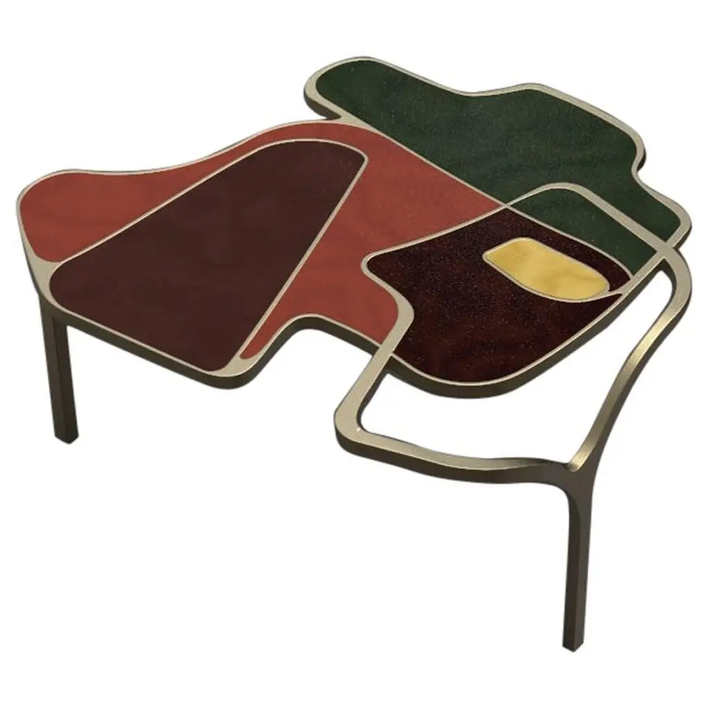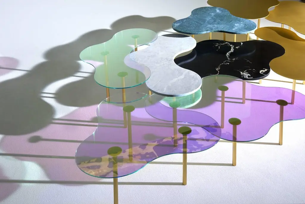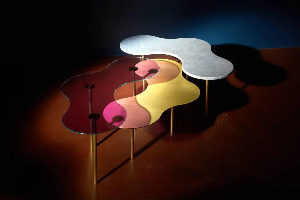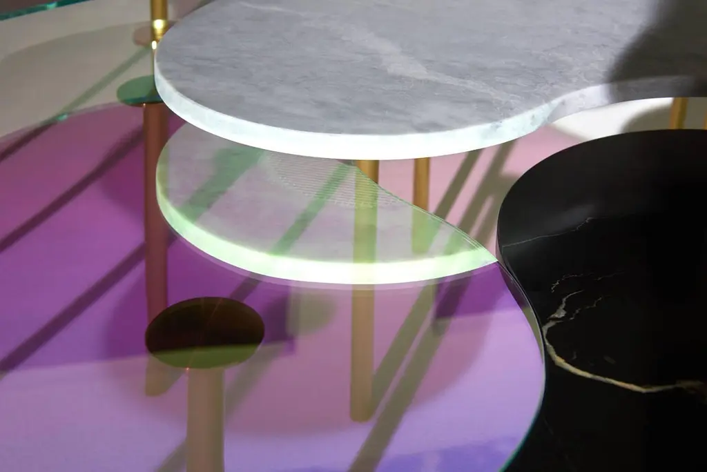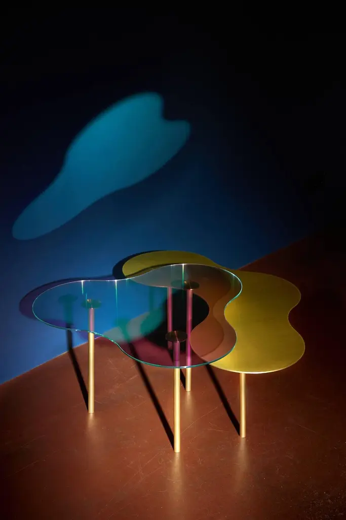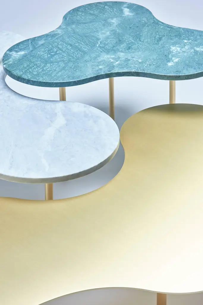 Brass coffee table ensemble of 3 by Sebastian SchererDimensions: CAMO A : W 75 x D 80 x H 40 cm CAMO B : W 60 x D 110 x H 30 cm CAMO C : W 60 x D 110 x H 35 cm Marble: Nero Marquina (black); Grigio Trambazina (grey); Verde Alpi (green)Brass: brushed (with protective coating)Dichroic Glass (laminated safety glass): blue/orange; gold/indigo; pink/green/The Camo tables are inspired by the camou?age pattern, which is used to disguise objects by making their contoursappear to dissolve. This effect is also visible on the Camo Tables: the three geometrical shapes were constructed froma constant circle radius to create a threedimensional camou?age pattern when they‘re grouped, which is extandableany number of times in every direction. The single shape appears to dissolve. The combination of the three materialsmarble, brass and glass in three different heights enable a great number of combination possibilities.