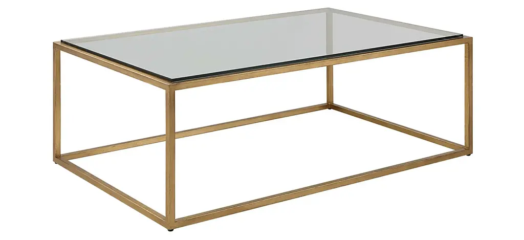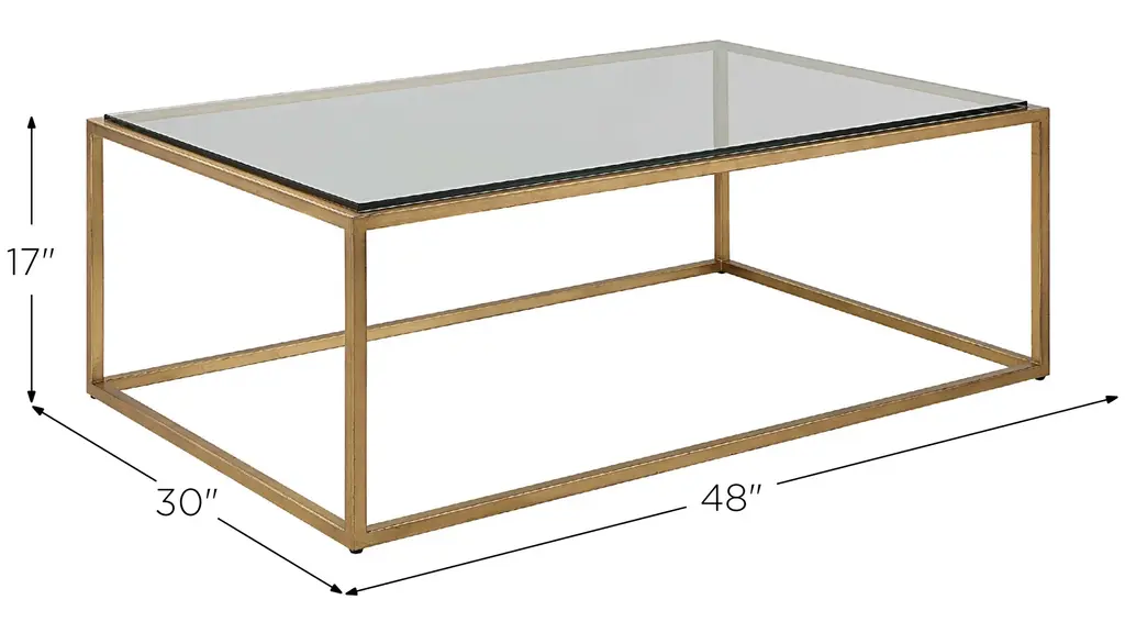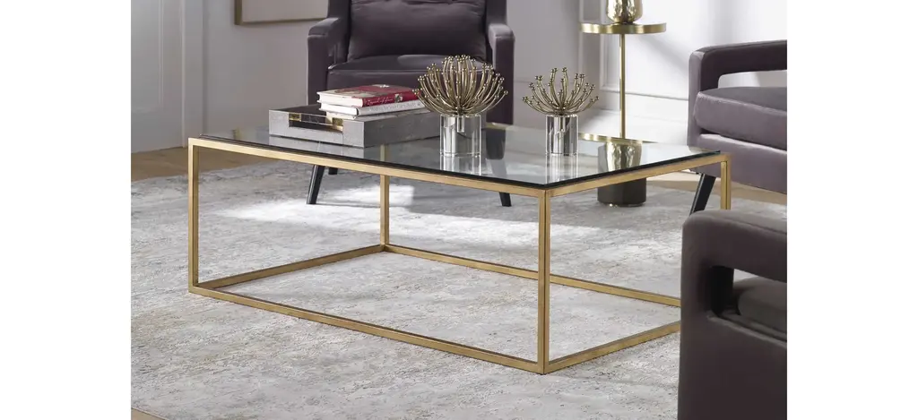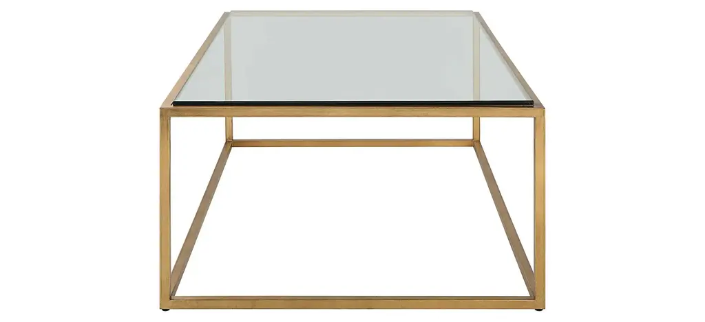 A complement to virtually any style, this Bravura Coffee Table features a streamline iron frame finished in brushed gold leaf with an inset tempered glass top.