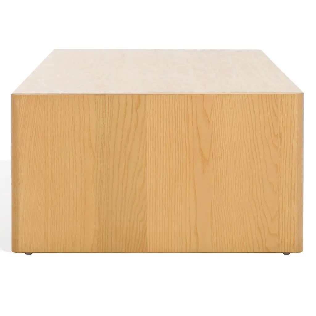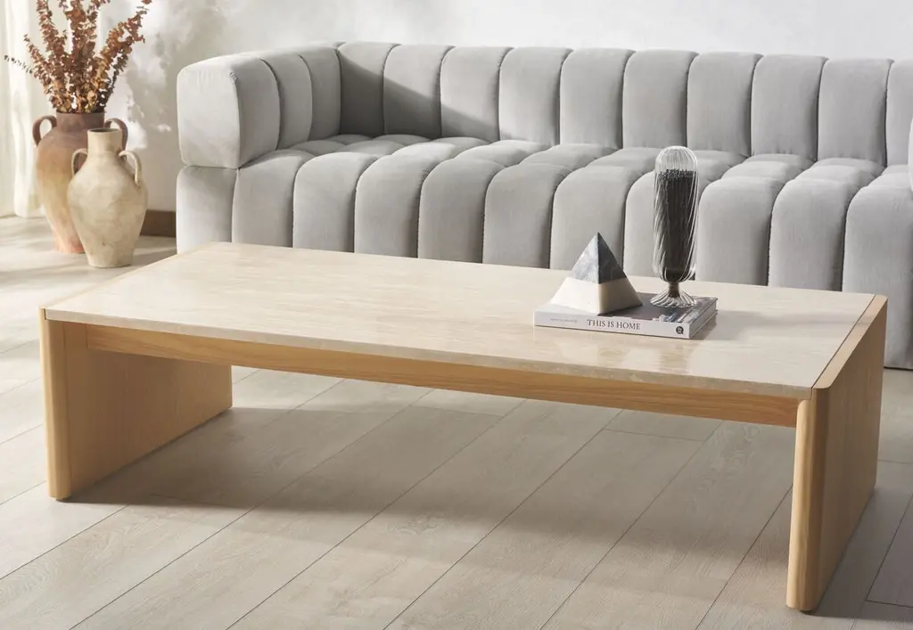 Bring sophisticated warmth and elegance to any room with our Bria coffee table. The sleek and modern profile of the table is elevated with a luxe mix of materials. Its rectangular tabletop showcases the earthy tone and distress marks of travertine. The tabletop appealingly complements the natural warmth of its subtly curved ashwood legs. Offering a warm and neutral palette, the coffee table attains a sleek and welcoming stature in your lounge, bedroom, or home office. It provides a spacious and elegant surface to display your beloved decor items.