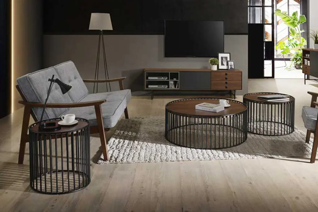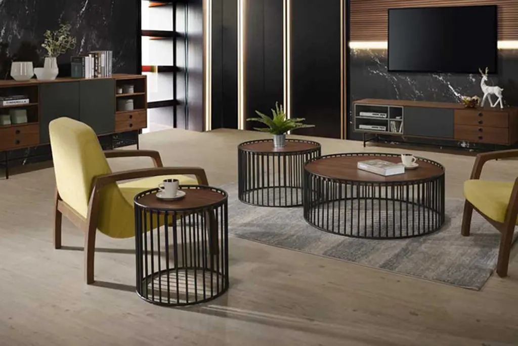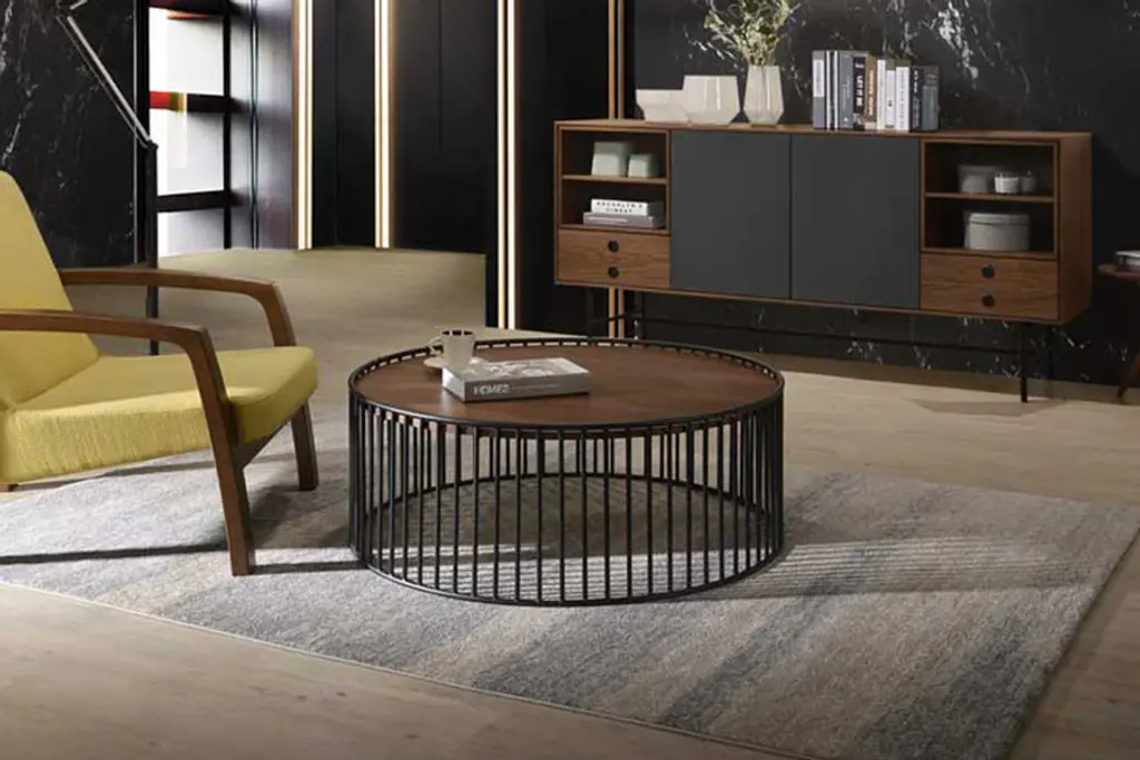 This modern wood look coffee table will please your inner interior designer. The beautiful walnut veneer top with black metal base is durable and strong. The vertical bar design make this piece sturdy as well as stunning.