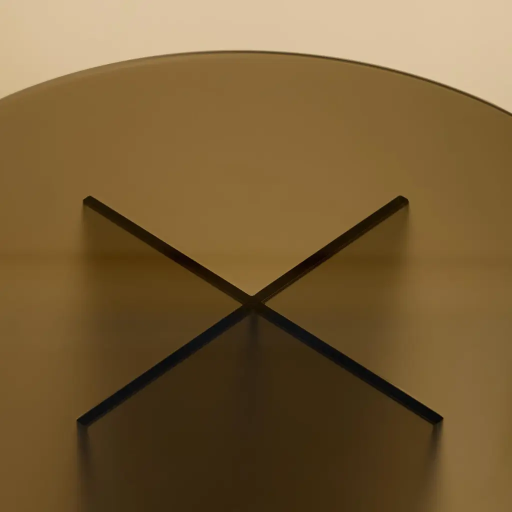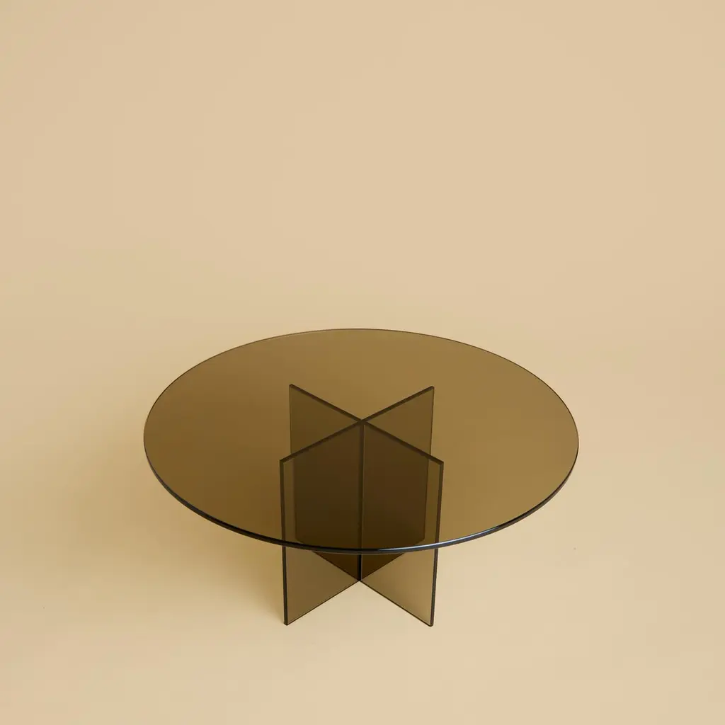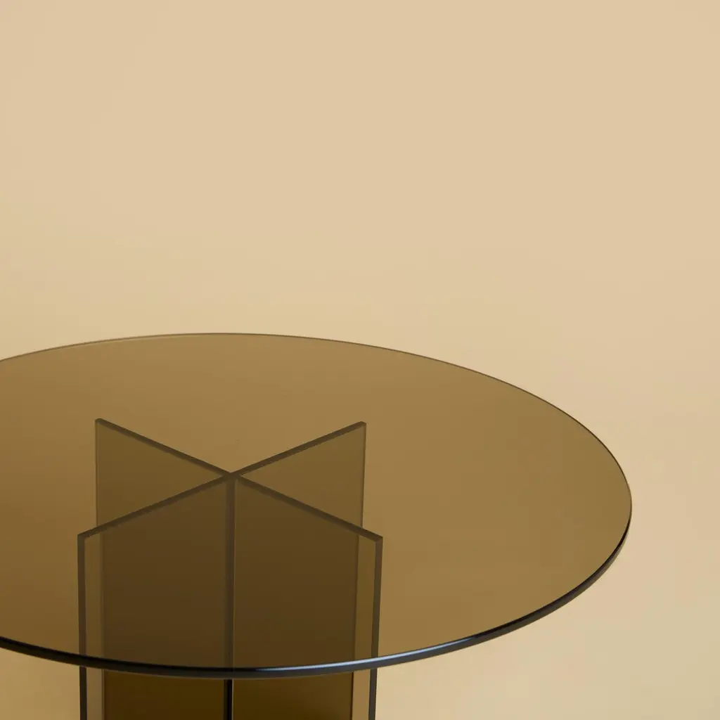 The coffee table Aka is made entirely of bronzed glass. The top is circular and 60cm in diameter, while the base is obtained by gluing slightly bevelled 6mm thick slabs.Bronzed glass for this table obtained by adding a touch of yellow to the material which makes it the perfect shade for classy environments that aim for brightness. This material picks up on the vibes of the 70s and radiates a very special charm. Placing it in a contemporary style environment creates a very interesting and elegant contrast.The bronzed effect gives great emotions in the living area of the house. Indeed, bronze is a warm color that helps to create particularly hospitable spaces, forgetting the cold classy to welcome this enveloping finesse.Dimension and glass type can be customizable. 100% Made in Italy.