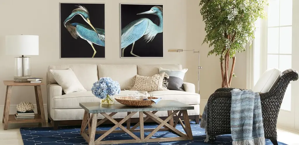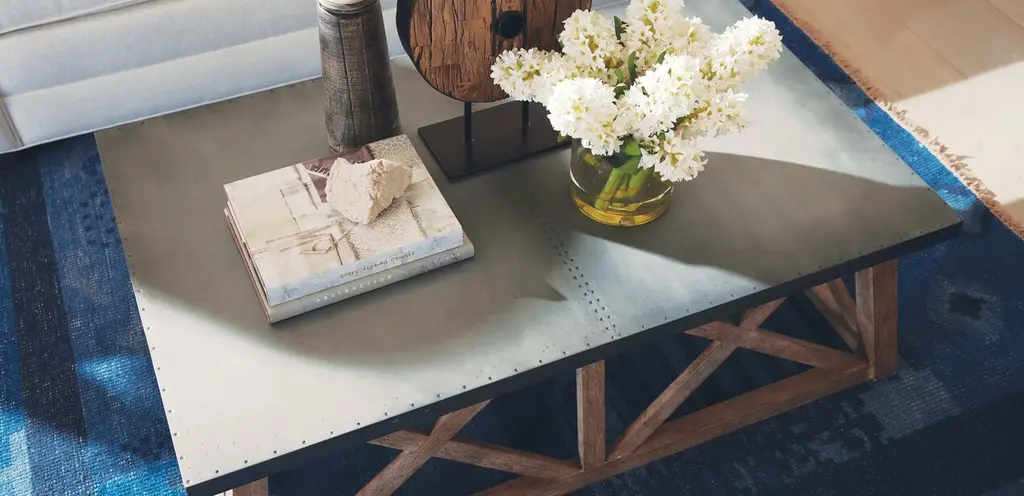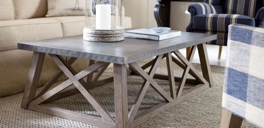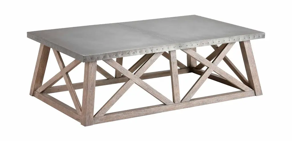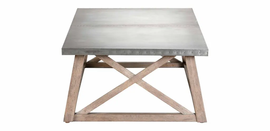 With its clean lines and architectural elements, this coffee table is perfect for more casual design styles. Made of rubberwood, the base is paired with a poplar top covered in zinc-finished sheet metal with brass nailhead trim for a cool industrial look.