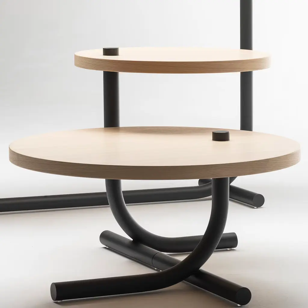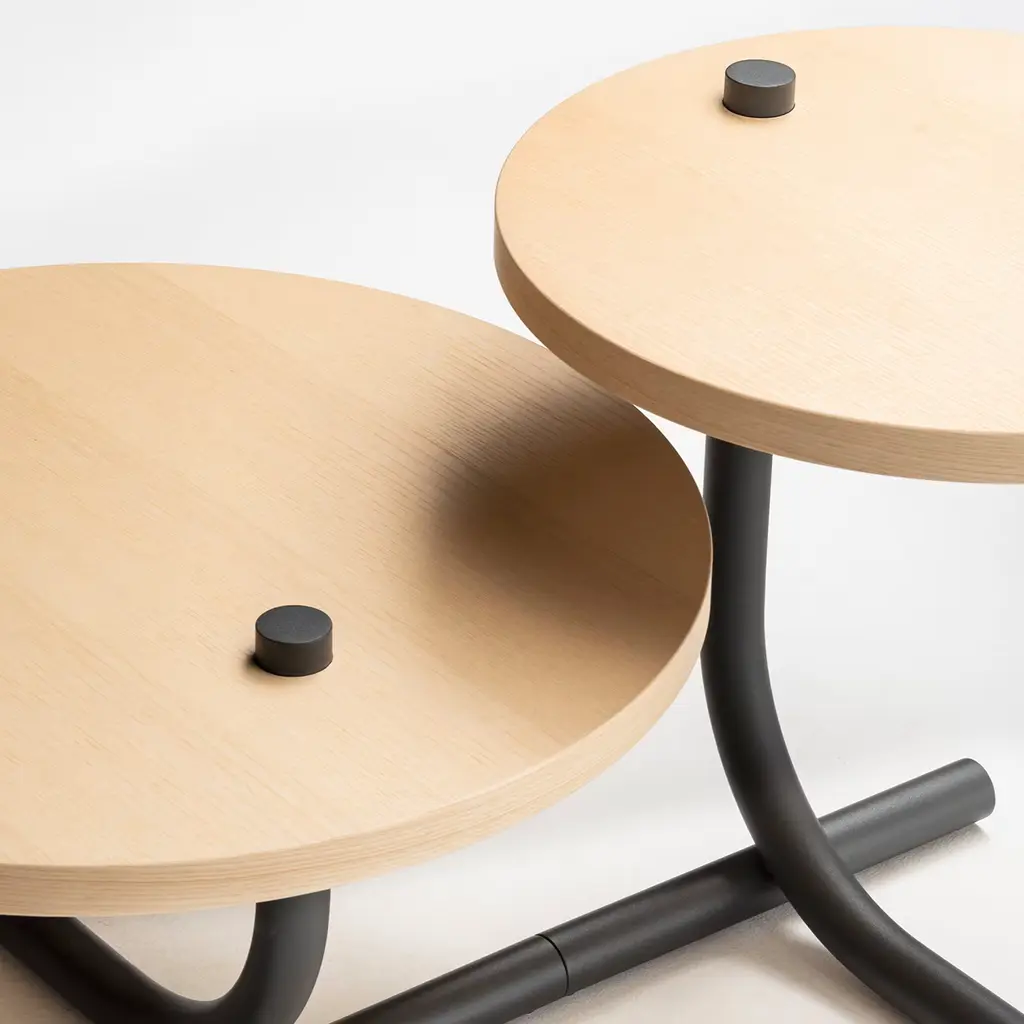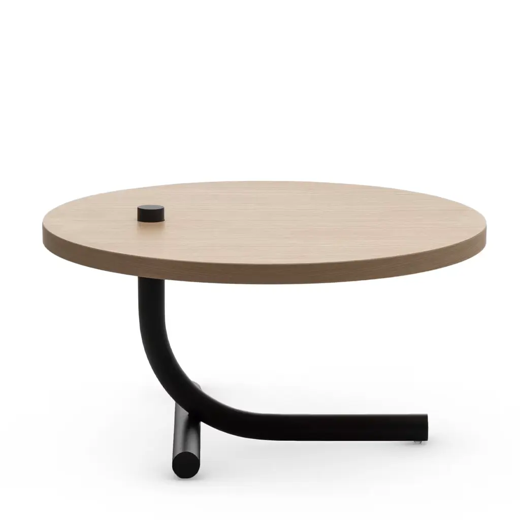 This circular side table by Sovrappensiero Design Studio is defined by a sculptural base with a curved cylindrical element sustained by a straight one facing the floor. Pierced at the side, the round top boasts a delicate polished natural ash veneer that counterbalances the deep anthracite tone selected for the base's powder coating. Please consult the Artemest catalog for variants.