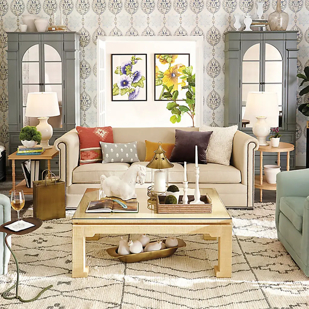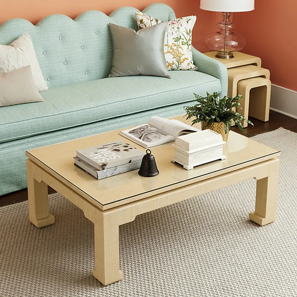 Bunny was inspired by the raffia-wrapped furniture of '70s designer, Karl Springer. Beautifully proportioned for easy entertaining, the Bunny Williams Raffia Coffee Table has modern Chinese lines with raised top and geometric horseshoe feet. Protective Glass Topper is made of tempered glass and precision cut, so edges align perfectly. Bunny William Raffia Wrapped Coffee Table features: