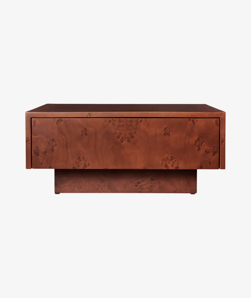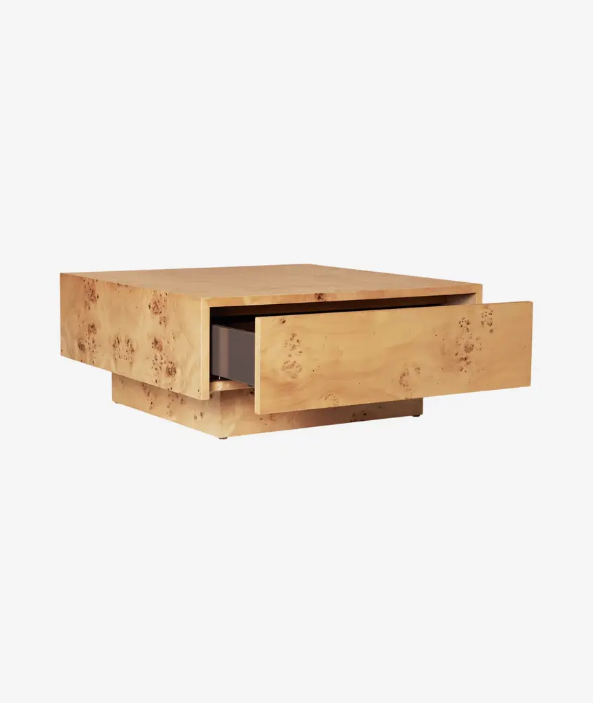 The Burl Storage Coffee Table features a square format with an added storage drawer. Crafted from FSC™ Mix-certified wood with a rich burl veneer, its swirling grain adds depth and visual warmth. The concealed drawer offers a discreet space for storing everyday items, keeping your living area calm and uncluttered.