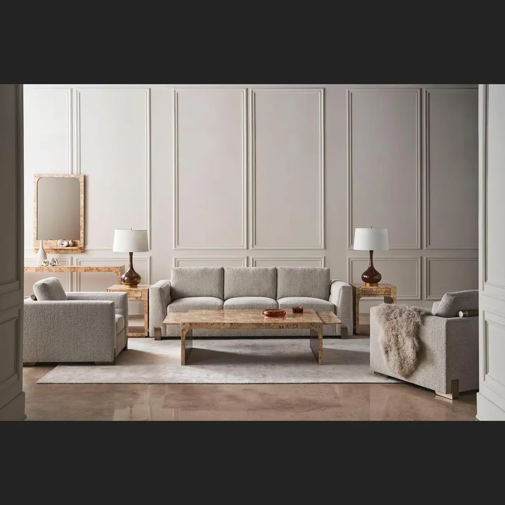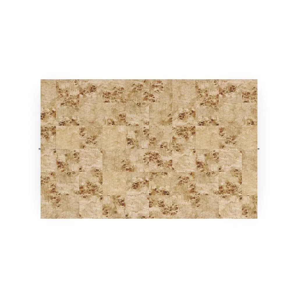 Classic in form and material, this multifunctional cocktail table makes an organic yet glamorous statement.Crafted from exotic mappa burl veneers, intricately pieced to showcase its highly figured, swirling grain. A Brazen bronze leaf finish underneath adds warm contrast and a soft glow.With two pull-out trays on either end to extend the top surface when entertaining guests.Dimensions: 56" W x 36" D x 17" H