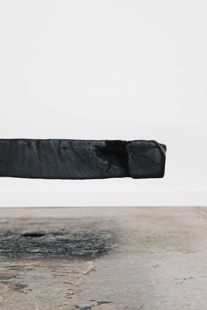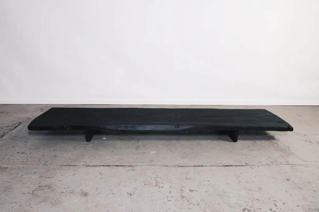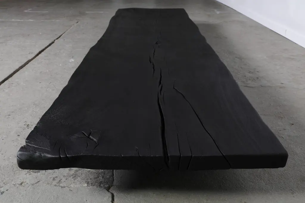 Burned Wood Coffee Table by Jesse Sanderson, WDSTCK StudioDimensions: L 295 x B 70 x H 20 cmMaterial: Burned woodIn search of a way to emphasize the sensual forms of the wood, we discovered an ancient method from Japan called Shou Sugi Ban. This intensive and time-consuming technique burns away the soft parts of the wood and reveals the inner structures of the wood. As an additional advantage, the wood is well preserved from weather, rot, and insects with a non-toxic method. The burned chunk has a comfortable flowing seat and is equipped with invisible wheels.Jesse Sanderson is a self-taught artist with a distinctive signature. He is fascinated by imperfection and allows natural forms to dictate his designs. Raw materials affected by weathering and aging tell a story about their origin and history, which he aims to emphasize wherever possible. By applying traditional craftsmanship and expressing his personal view, he designs intelligent yet simple-hearted objects.