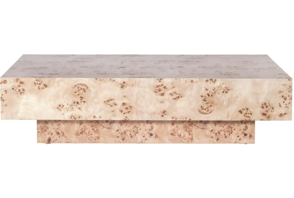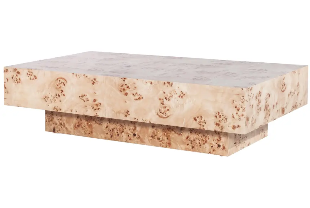 The Burton Modern Natural 52" Burl Wood Rectangle Drum Coffee Table is a perfect centerpiece for any living room. Its contemporary design and natural color blend seamlessly with modern decor, adding a touch of sophistication to your space. Constructed from burl wood and plywood, this table is as durable as it is stylish.