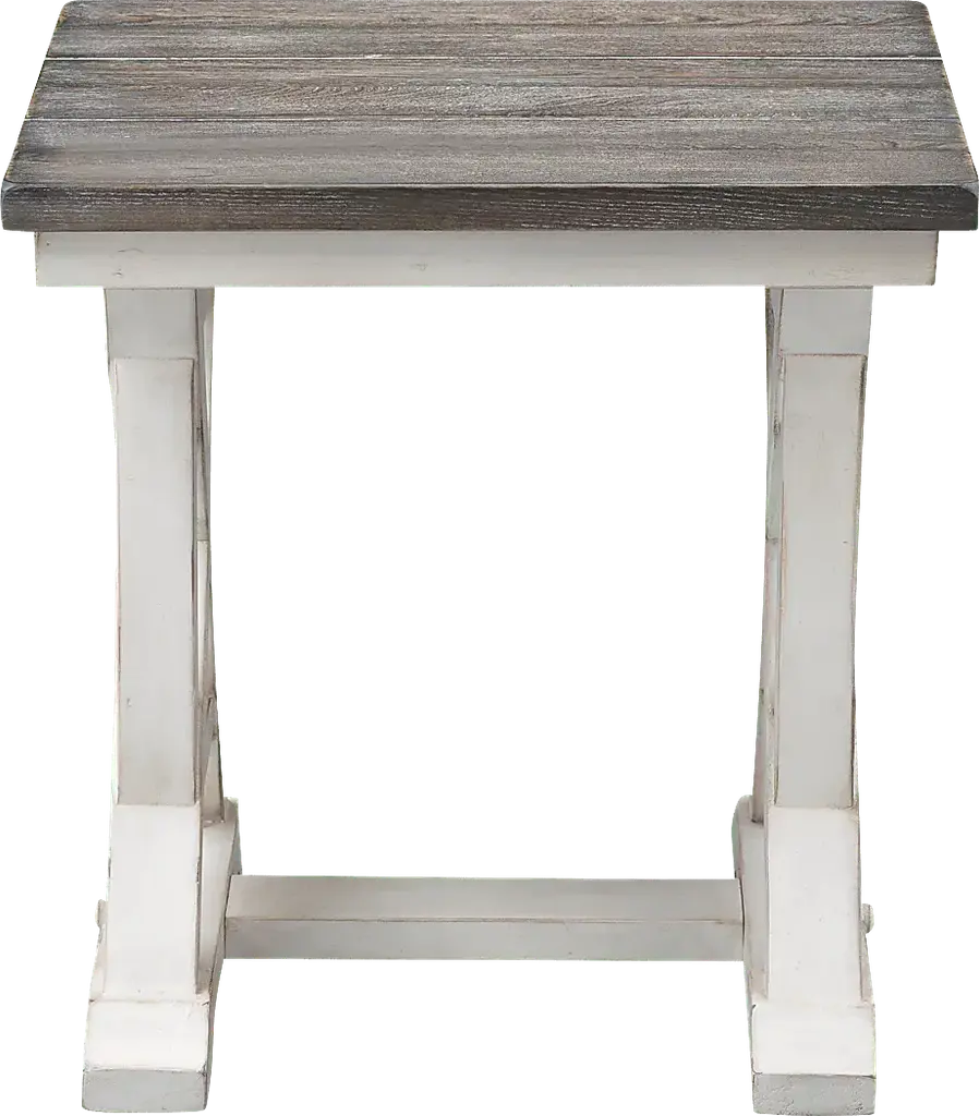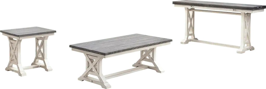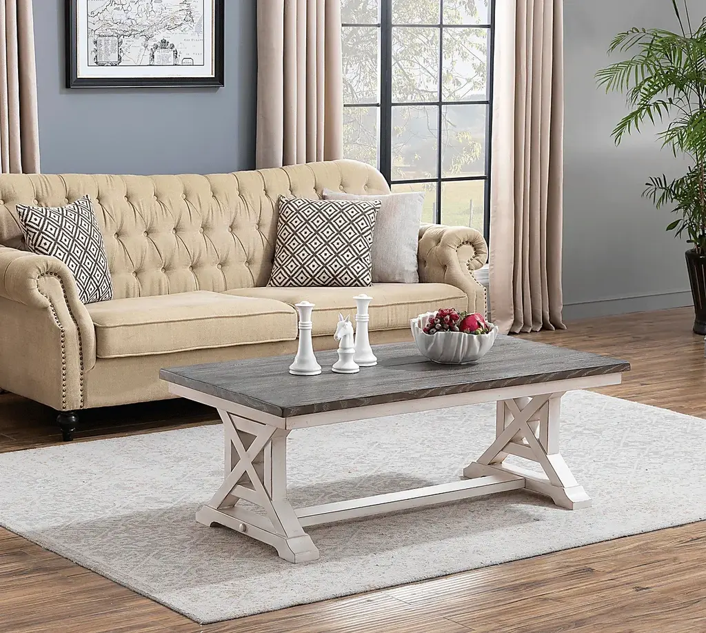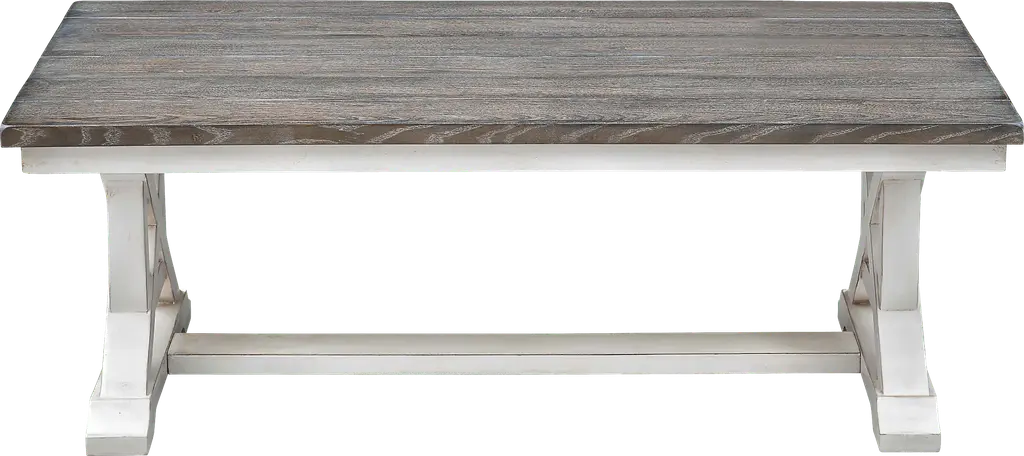 Set the stage for casual entertaining with the Bywood cocktail table finished in a light cream with a top of natural wood grained plank construction. The trestle style base has an X cross design on the legs and a lower crossbar, and the spacious surface provides plenty of room for games, puzzles or snacks. Perfect alone, but we also offer many coordinating pieces for you to pick and choose from in order to create the family fun room you have always wanted Customer assembly is required.