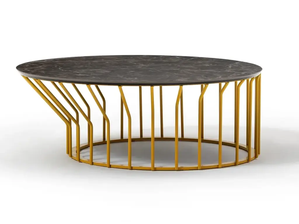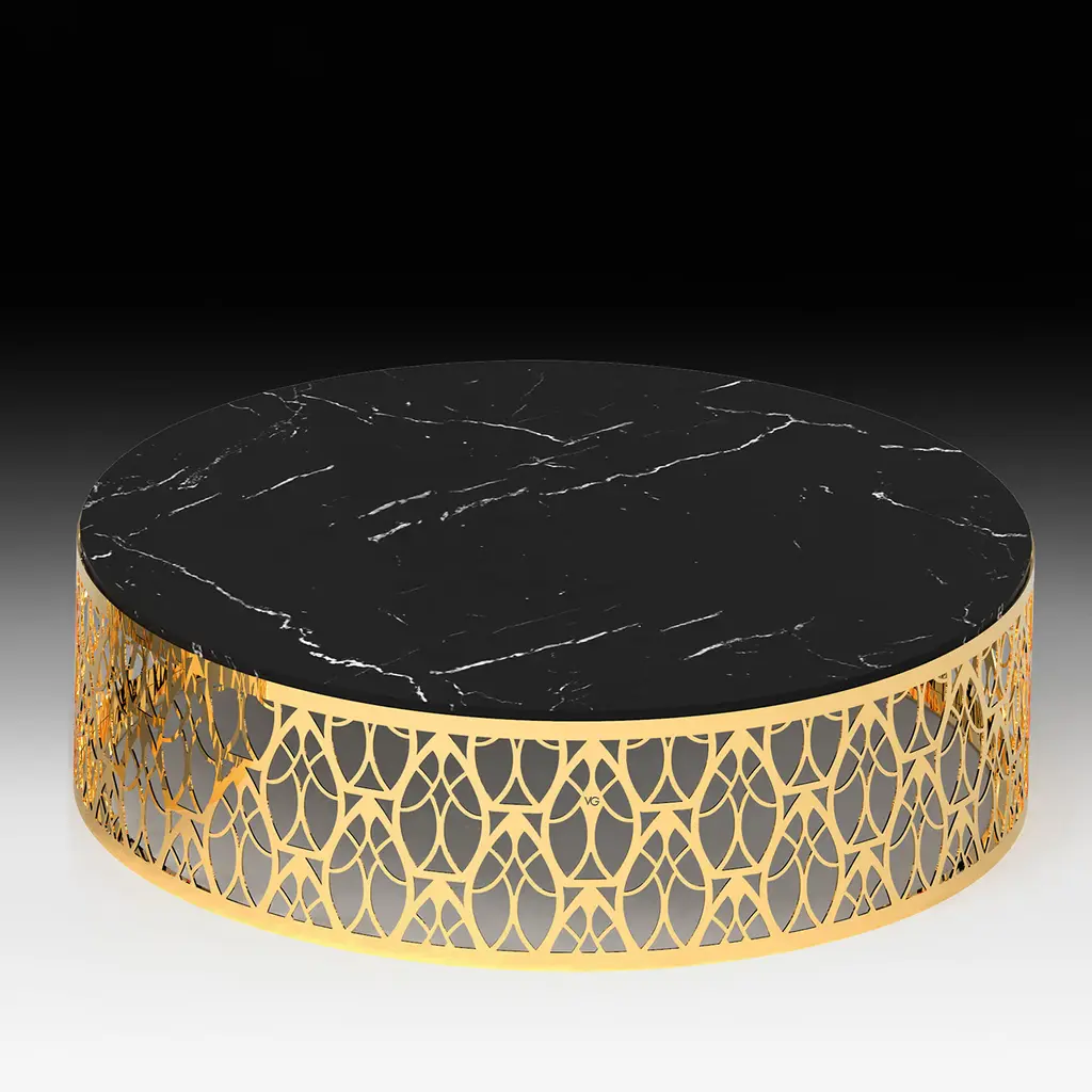Part of a series of small coffee tables exuding a majestic and opulent character, this piece will add character to interior decor. Boasting a rounded shape, it features a gold-finished metal base of Arabesque inspiration, topped with a black marble surface. Available in other sizes, please consult the Artemest catalog for options.