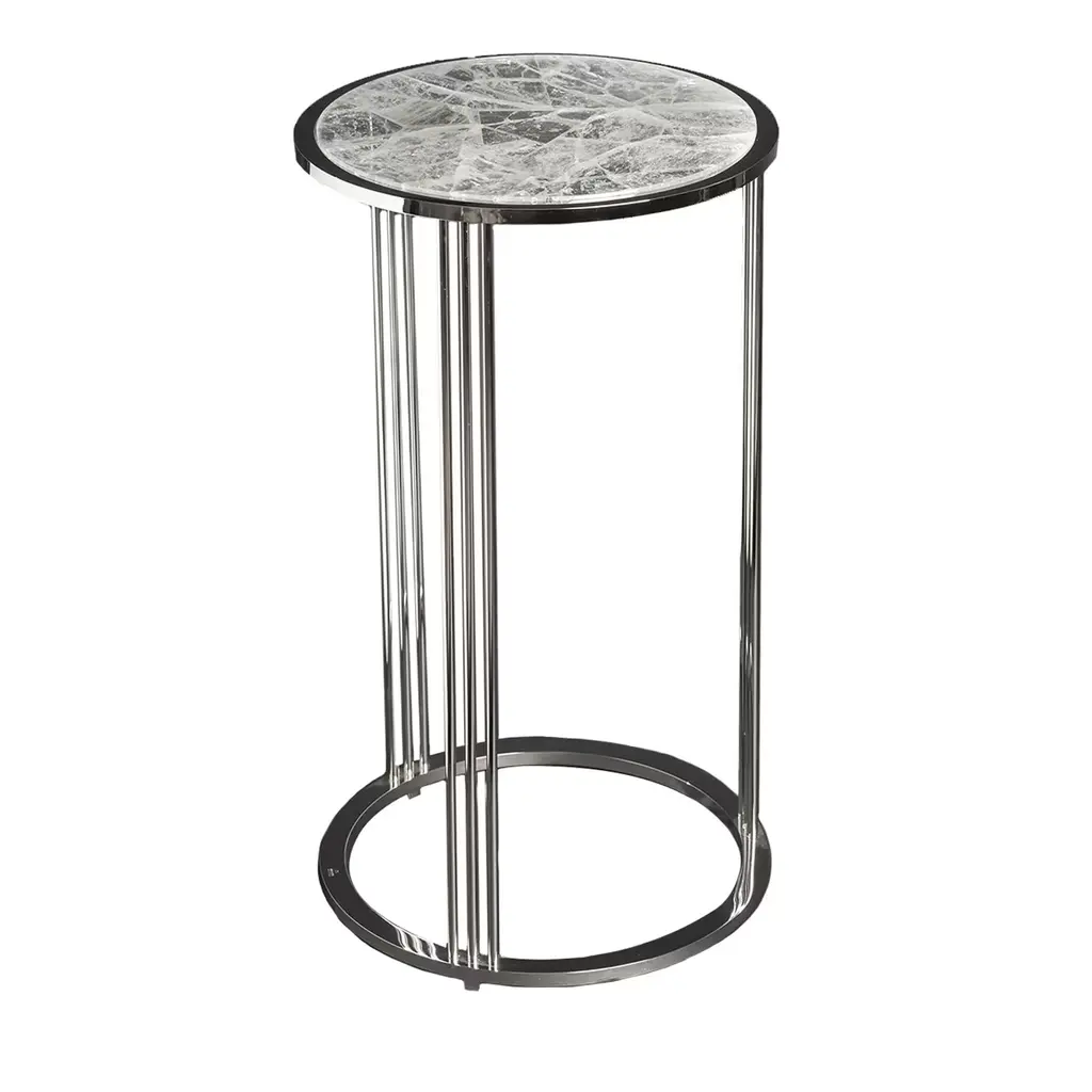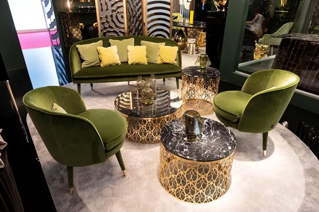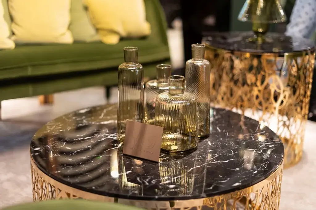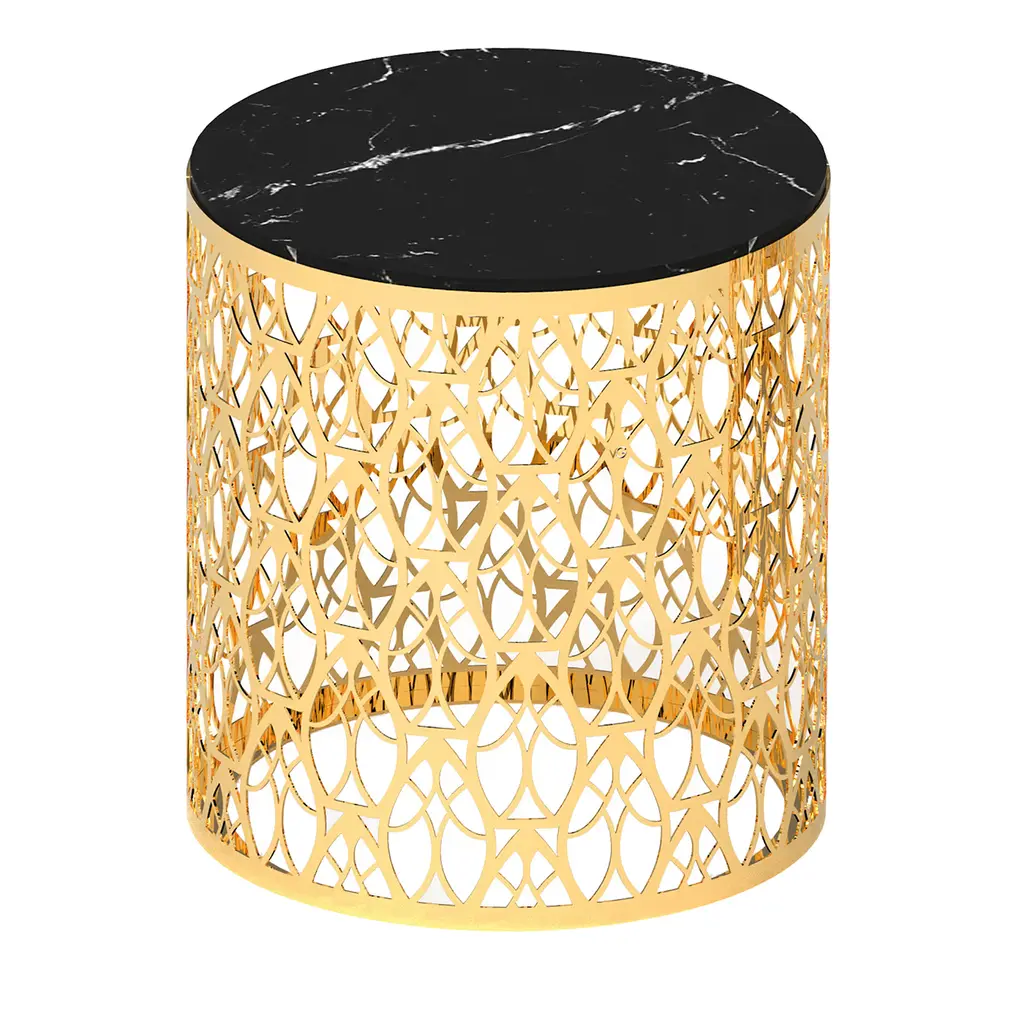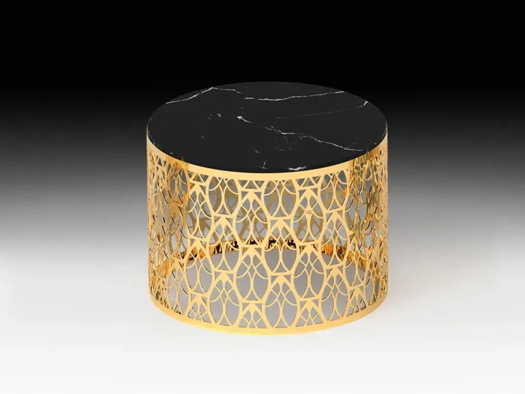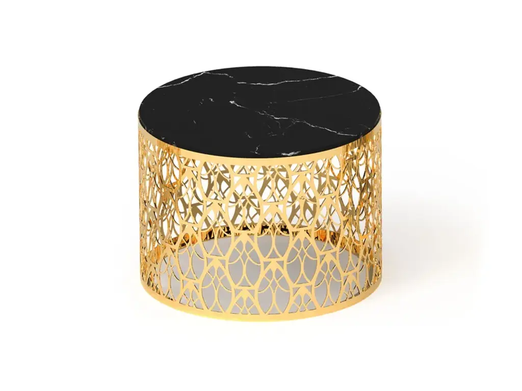 Cabaret is a round coffee table with the supporting surface in marble, softened by the metal base with perforated workmanship of the Arabesque series. Small but very charming, despite their small sizes, the Cabaret tables are a fusnishing accessory that can give character to an entire room. Available in different sizes.