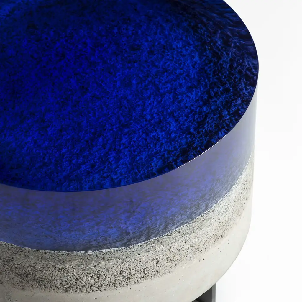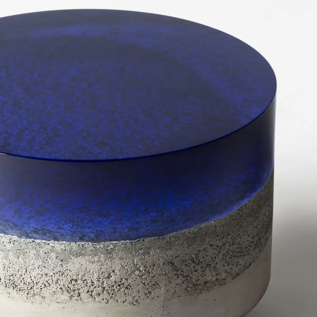 Made from a coarse concrete base covered with thick epoxy resin, Cala coffee table evokes the lacustrine landscape of Como. Resin is meticulously cast in layers to recreate a deep and shifting top, that seems to reveal the lakebed underneath. Borne by metal supports, the rounded shapes recall the smoothing action of flowing water. Available in different colors.