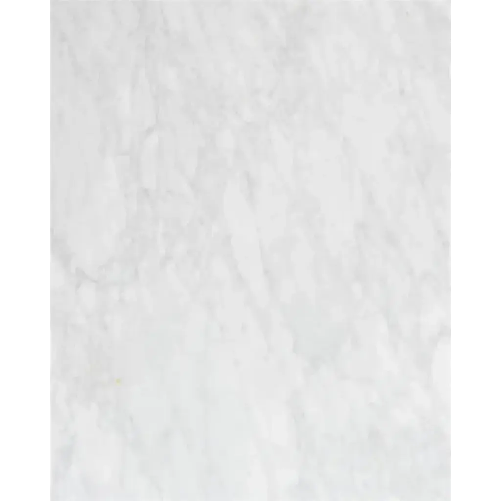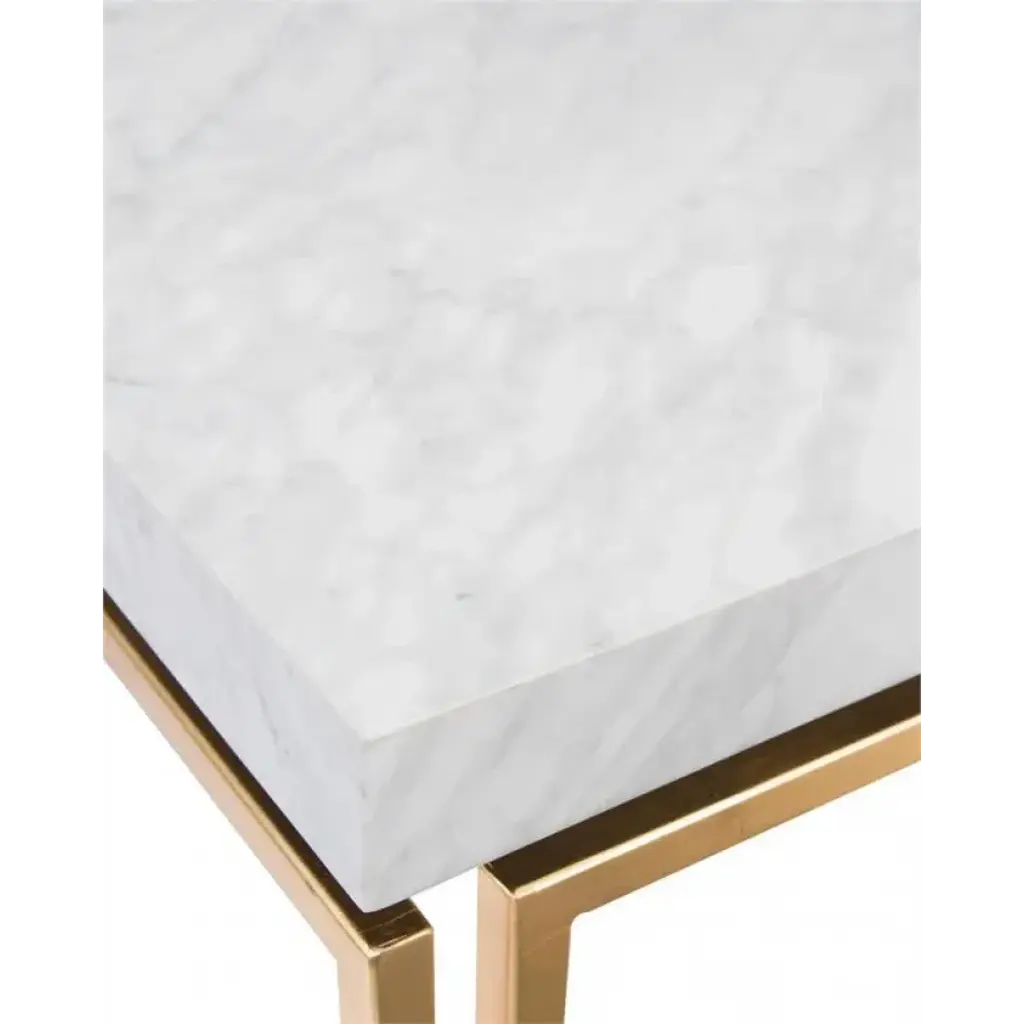 The Carrara marble top of this cocktail table is supported by a steel base finished in gold. The base features double legs strapped together with ties, which are repeated underneath the top.