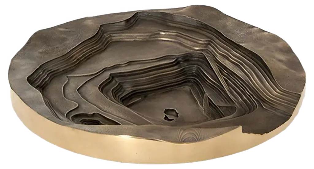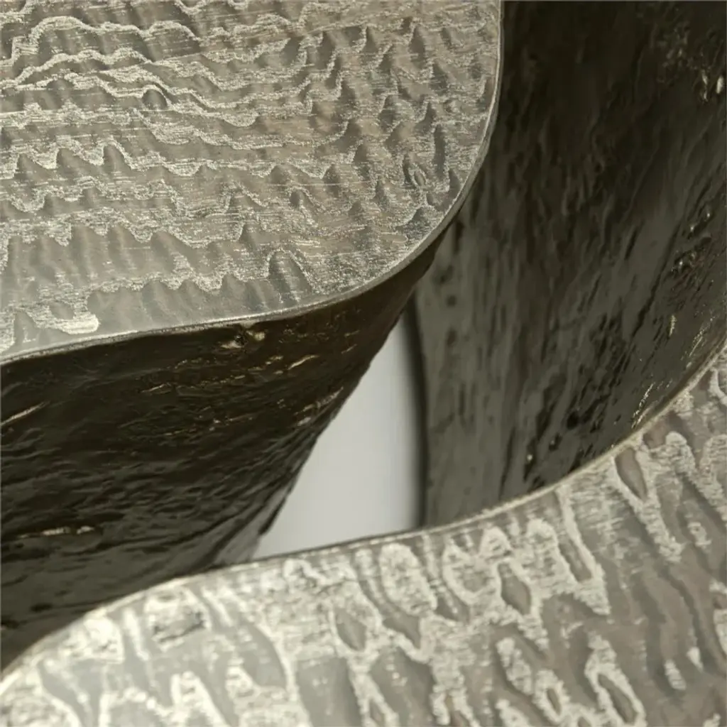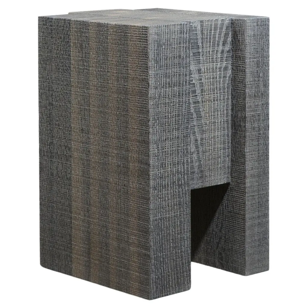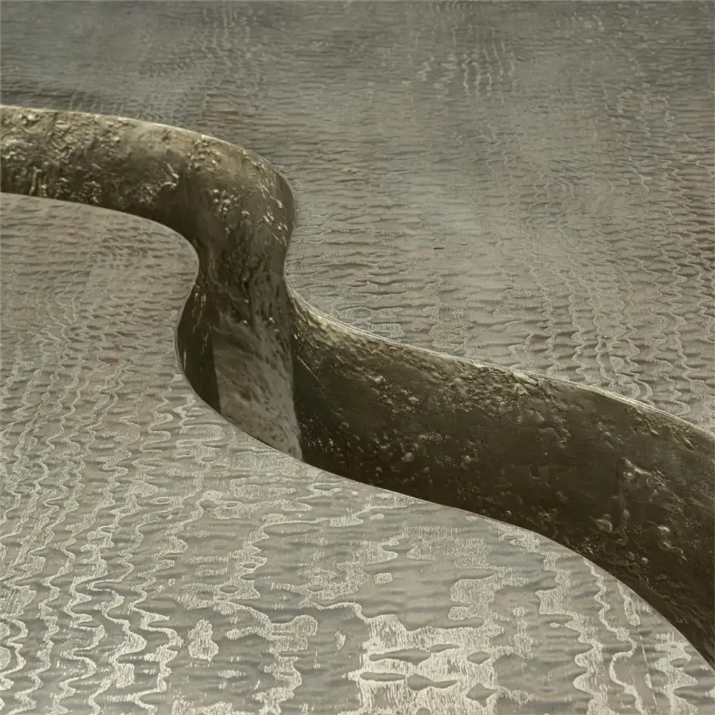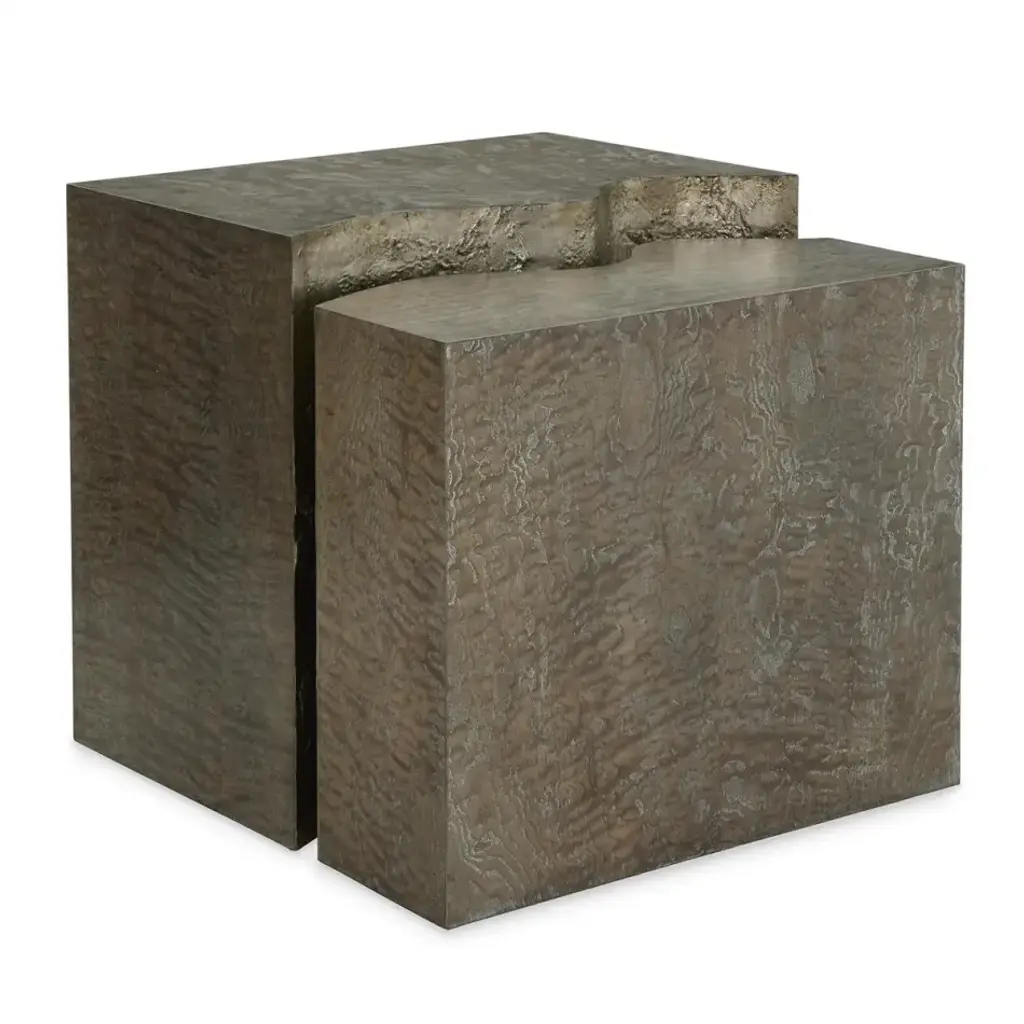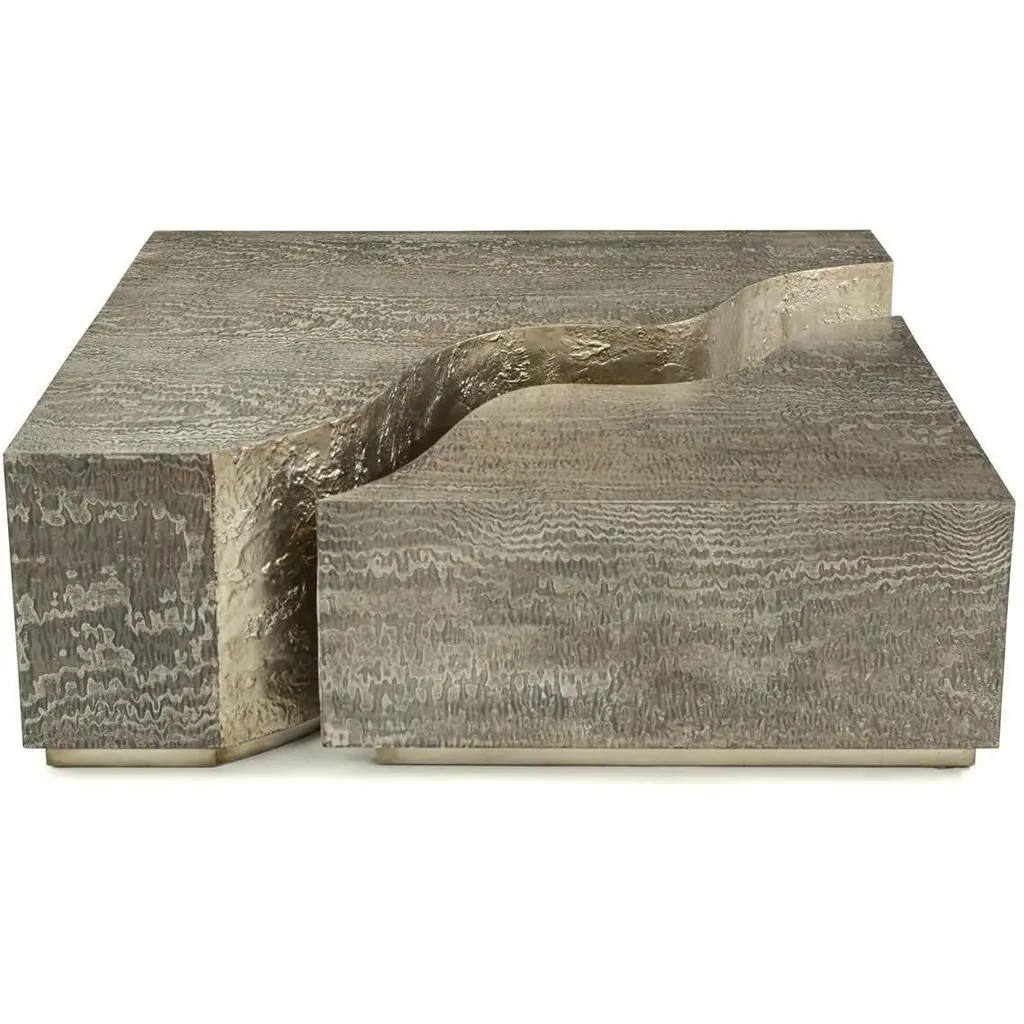 This architectural cocktail table features two pieces that fit together to create a contemporary bilevel effect. The sophisticated Silvered Tamo Ash veneer is enhanced with textured Burnished Silver Leaf along the split.