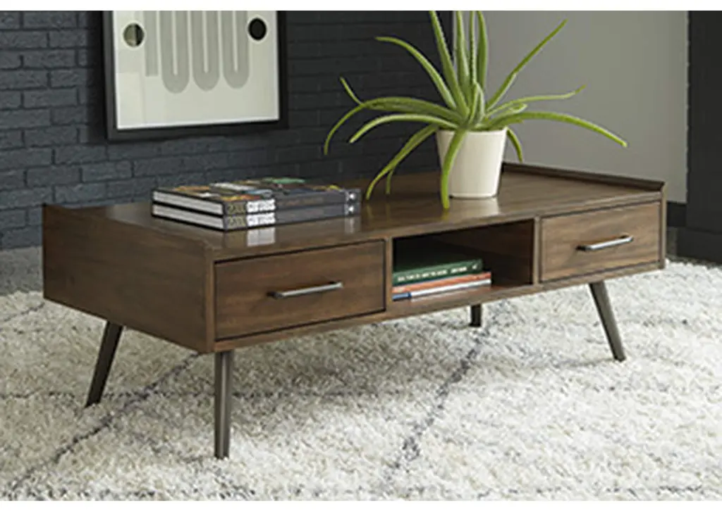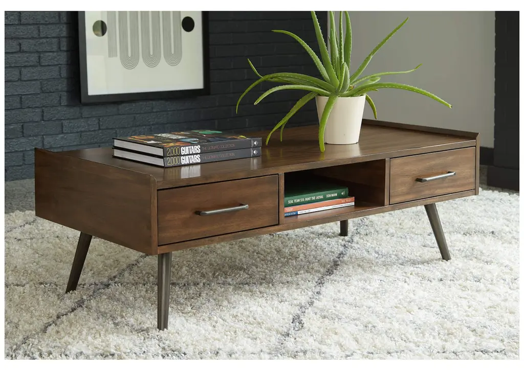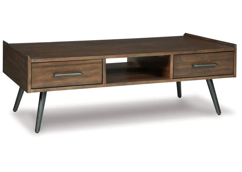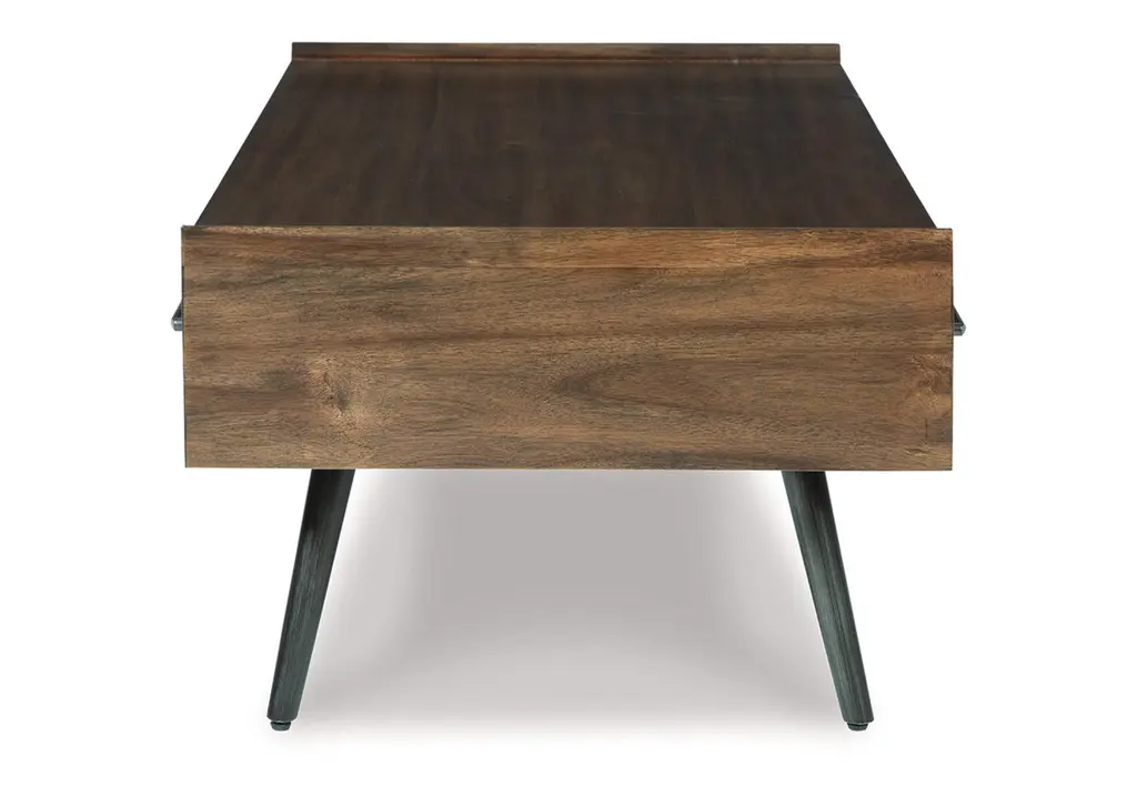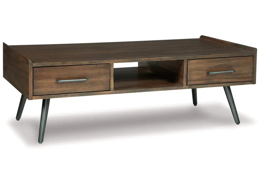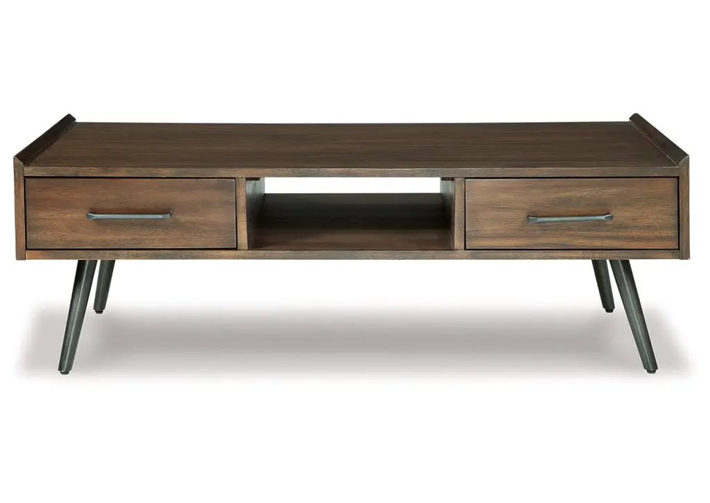 Retro yet relevant. This coffee table is a great case of mid-century influence with cool, contemporary flair. Ultra-linear tabletop is supported by canted round metal legs for a signature look that reflects your eye for beautiful things.