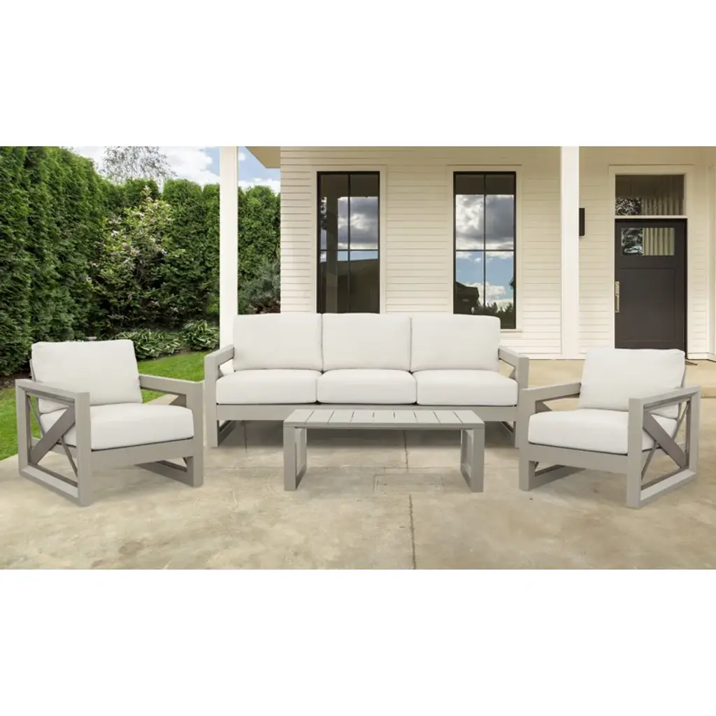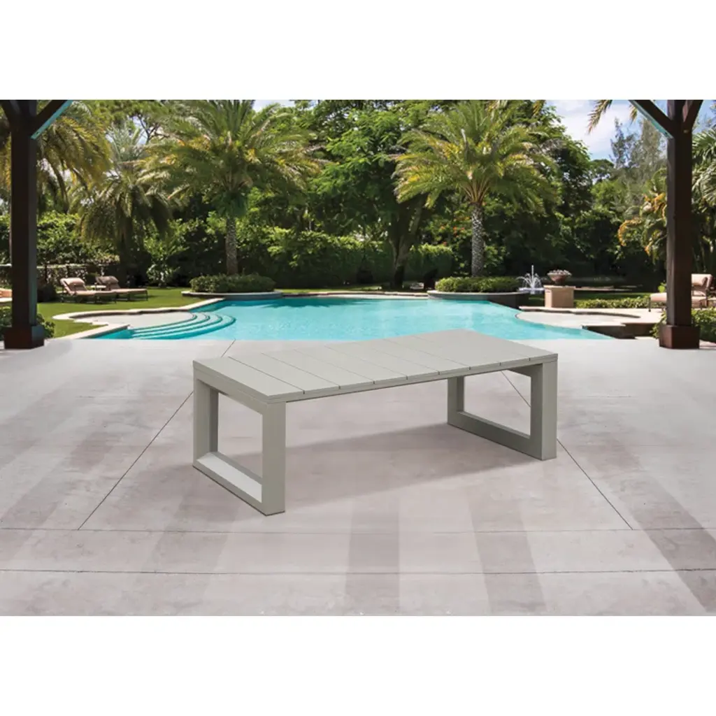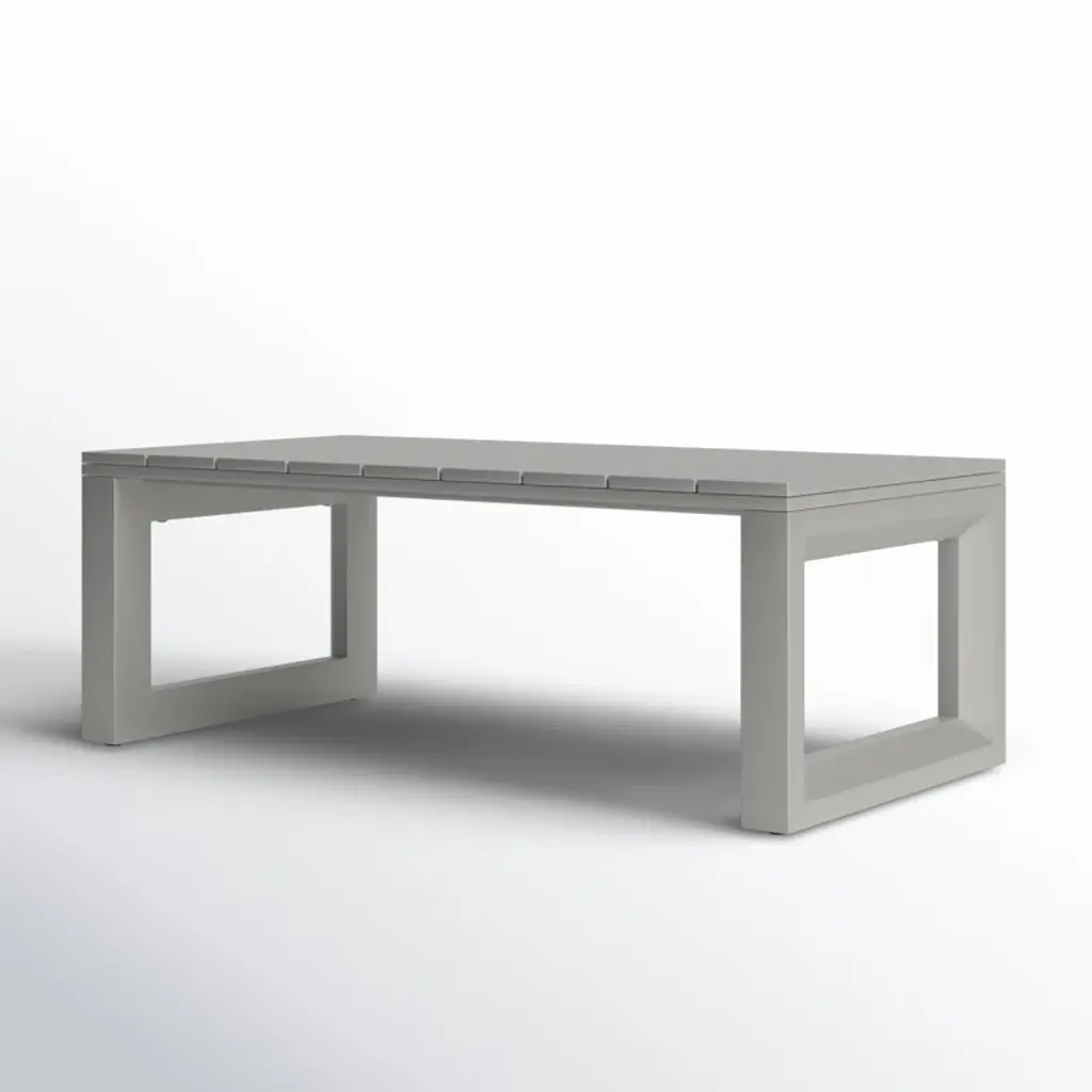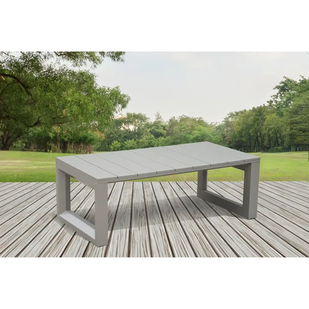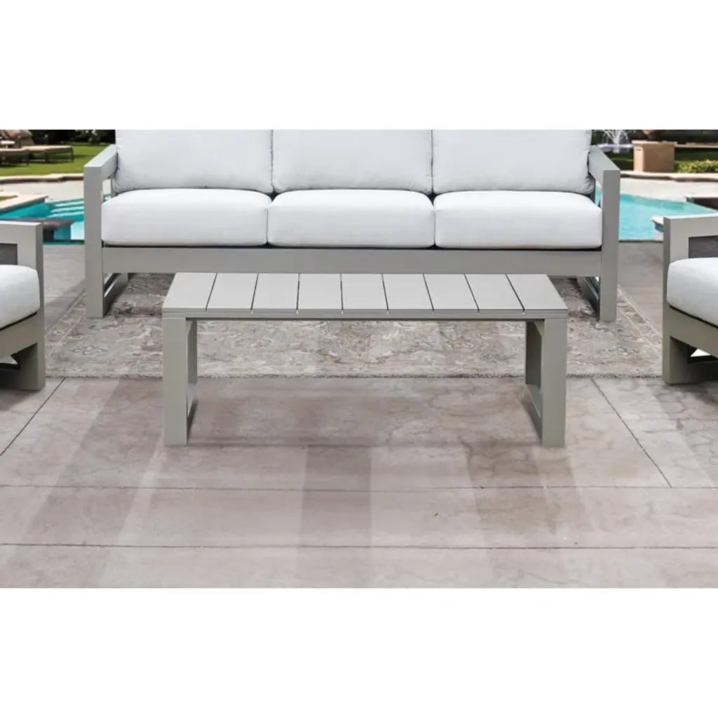 Neutral contemporary style in an outdoor set that will make your patio a showcase. This coffee table looks like it was sculpted for the great outdoors with beveled end panels that frame a modern geometric pattern. Although it looks like an indoor item, this table is built for the outdoors with a rust-resistant aluminum frame that is also scratch and weather-resistant.