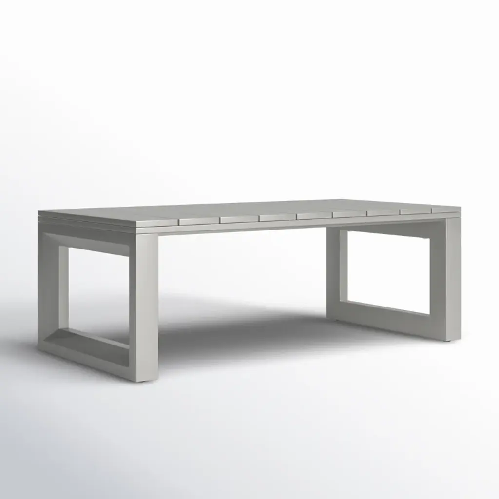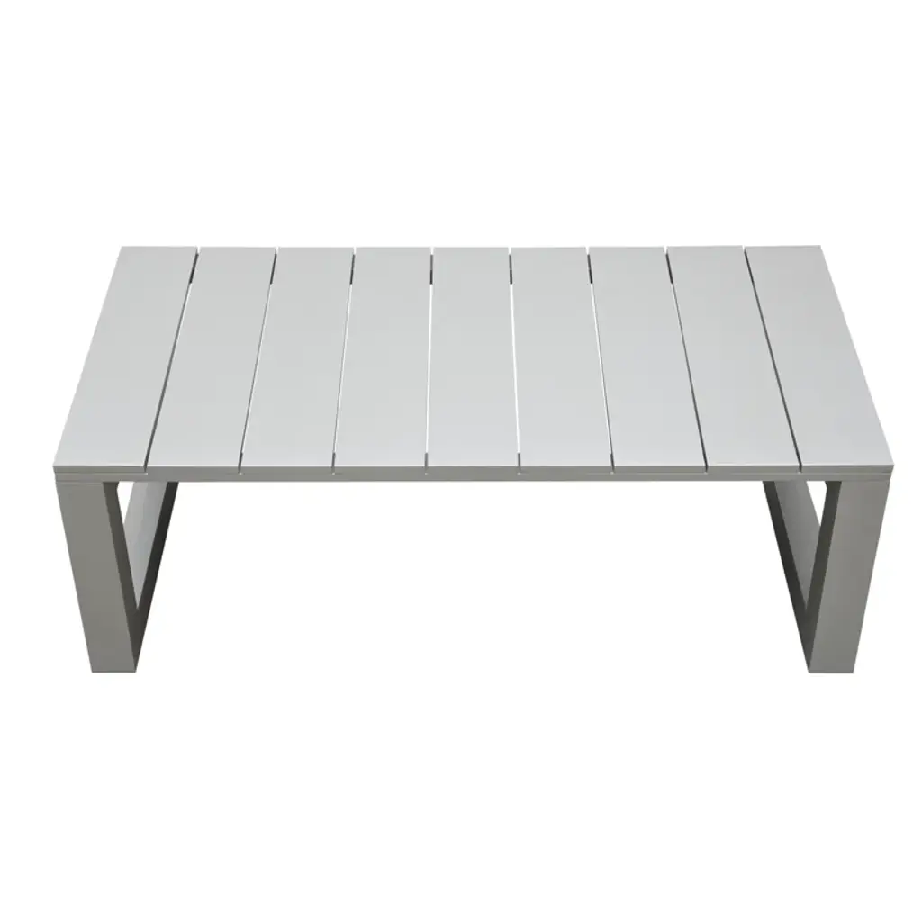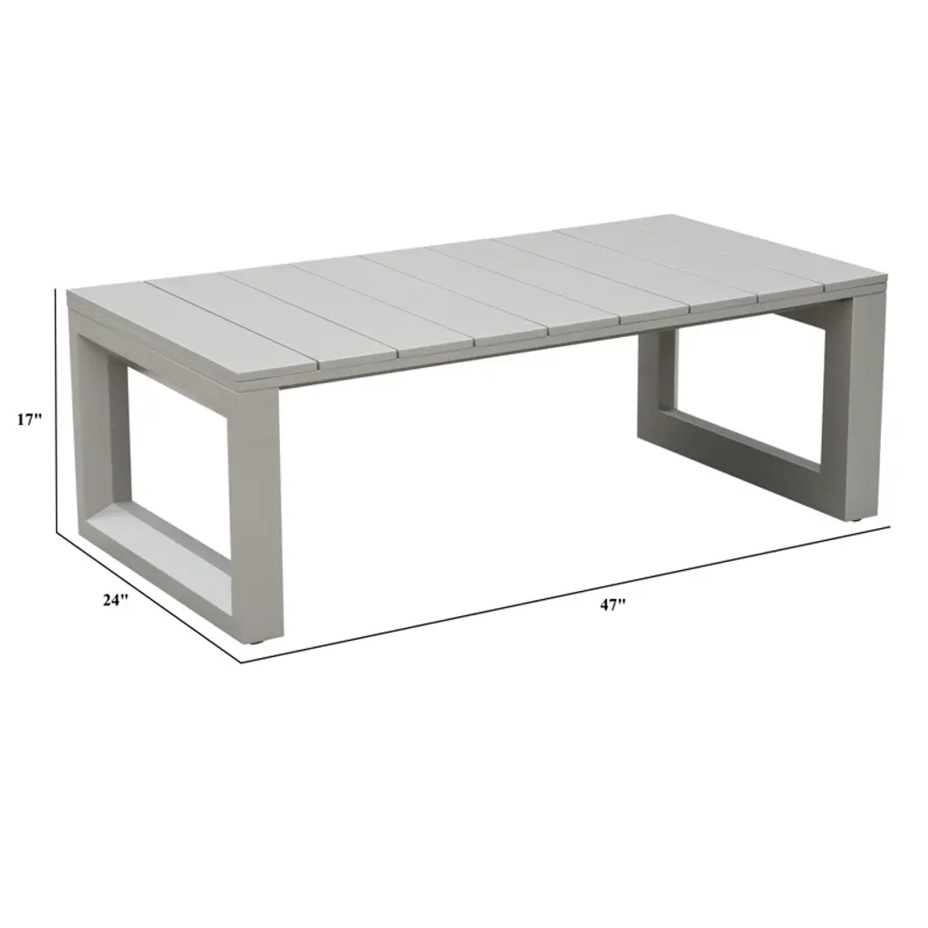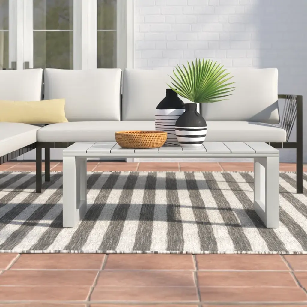 Neutral contemporary style in an outdoor set that will make your patio a showcase. This coffee table looks like it was sculpted for the great outdoors with beveled end panels that frame a modern geometric pattern. Although it looks like an indoor item, this table is built for the outdoors with a rust-resistant aluminum frame that is also scratch and weather-resistant.