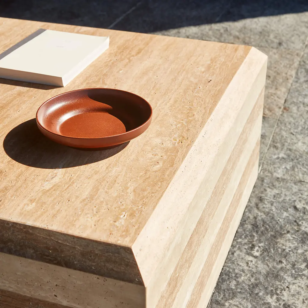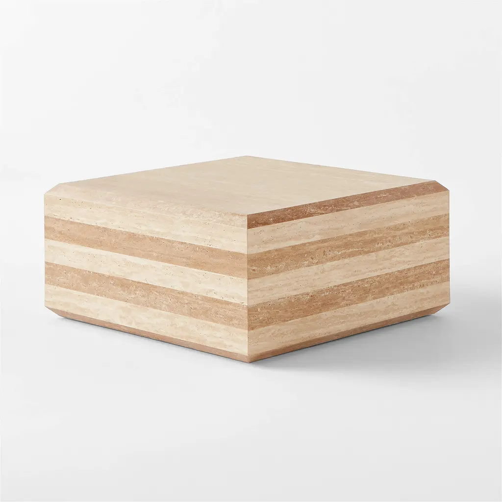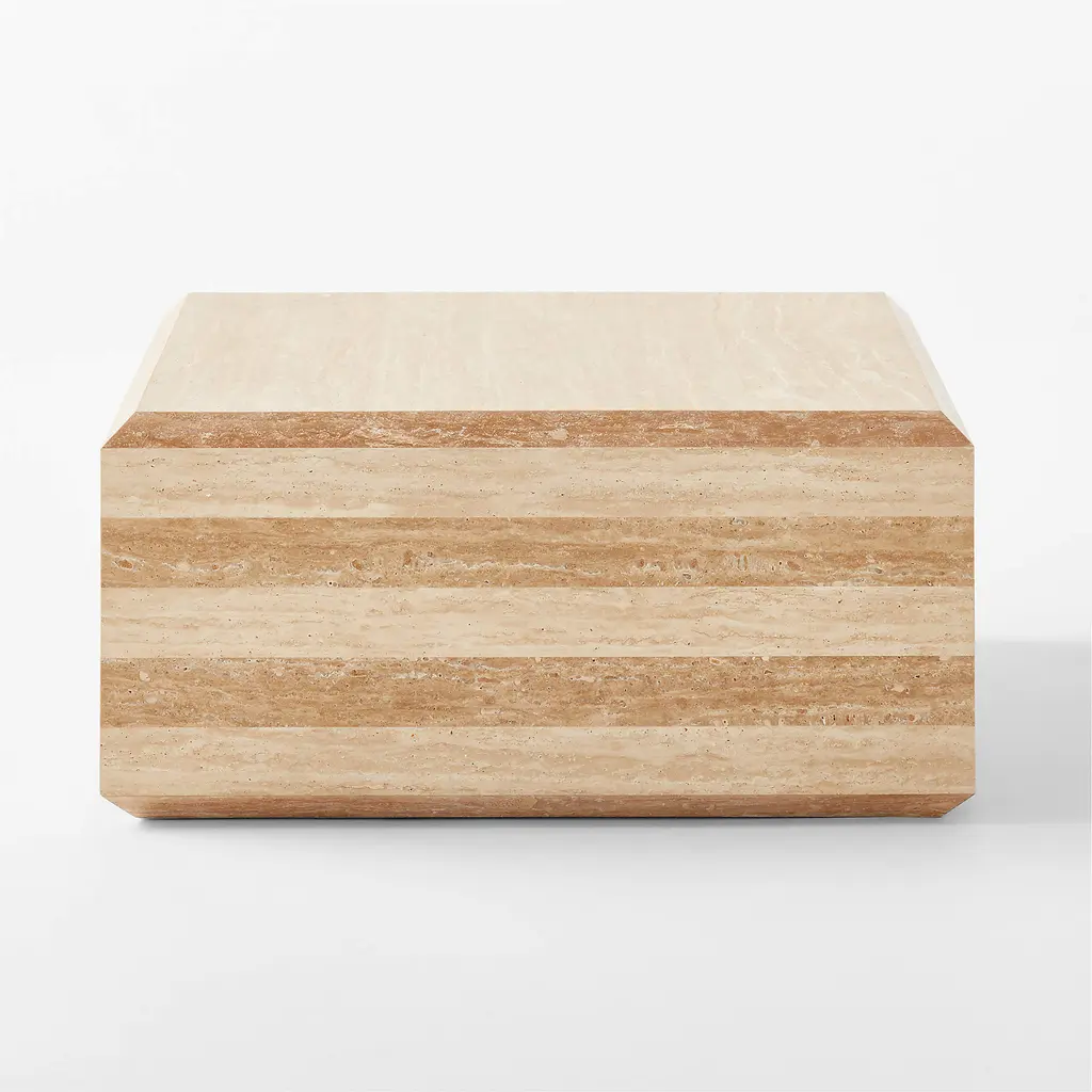 Horizontal layers of yellow travertine alternate between light and dark tones in Mermelada Estudio's monolithic outdoor coffee table. Clean, minimal beveled edge highlights the stacked stone above, calling attention to the natural variations and beauty that make this table a showpiece both indoors and out. CB2 exclusive.