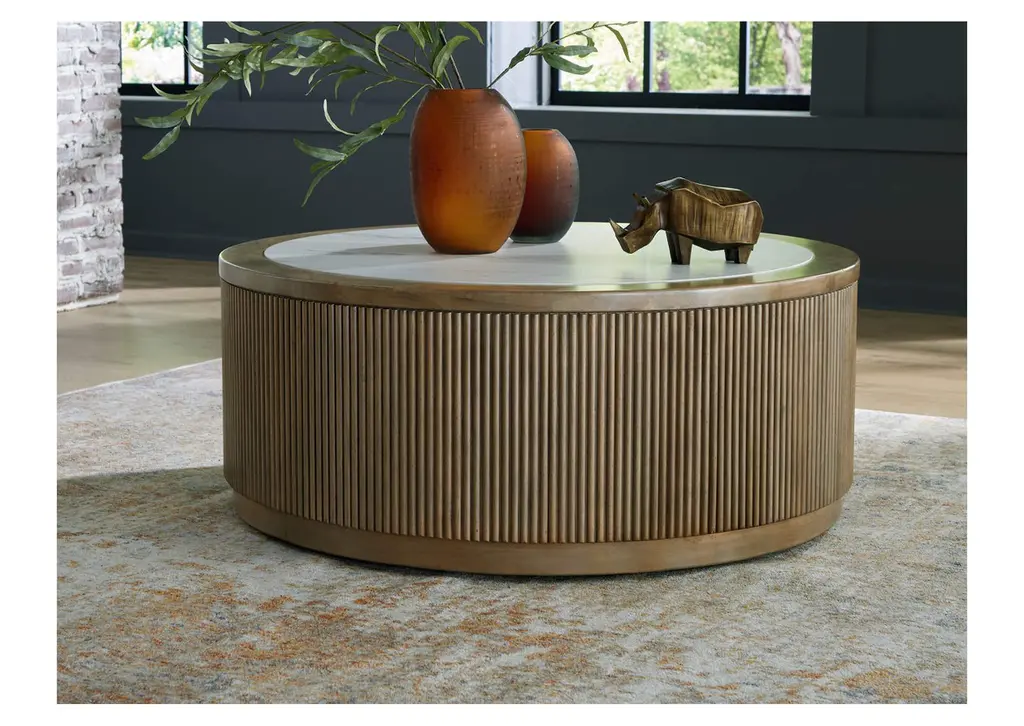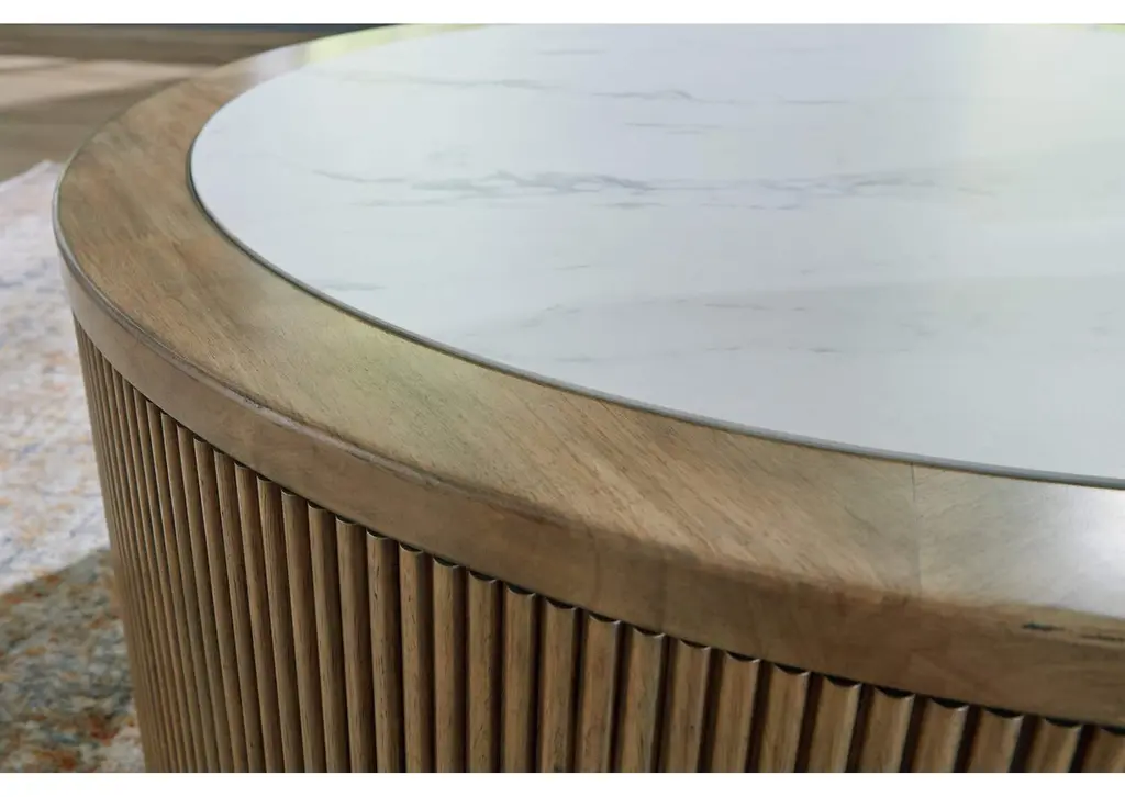 Elegance meets earthy charm in the Camdill coffee table. Crafting a contemporary living room? The faux Carrara marble top expertly pairs with the reeded base for a trend-right take on day-to-day function. It’s an ideal spot to rest decorative books and accents. Or place a tray on top to hold remotes and other entertainment essentials. Casters allow you to rearrange as you please. Weight 114.000 lbs. (51.3kgs.)