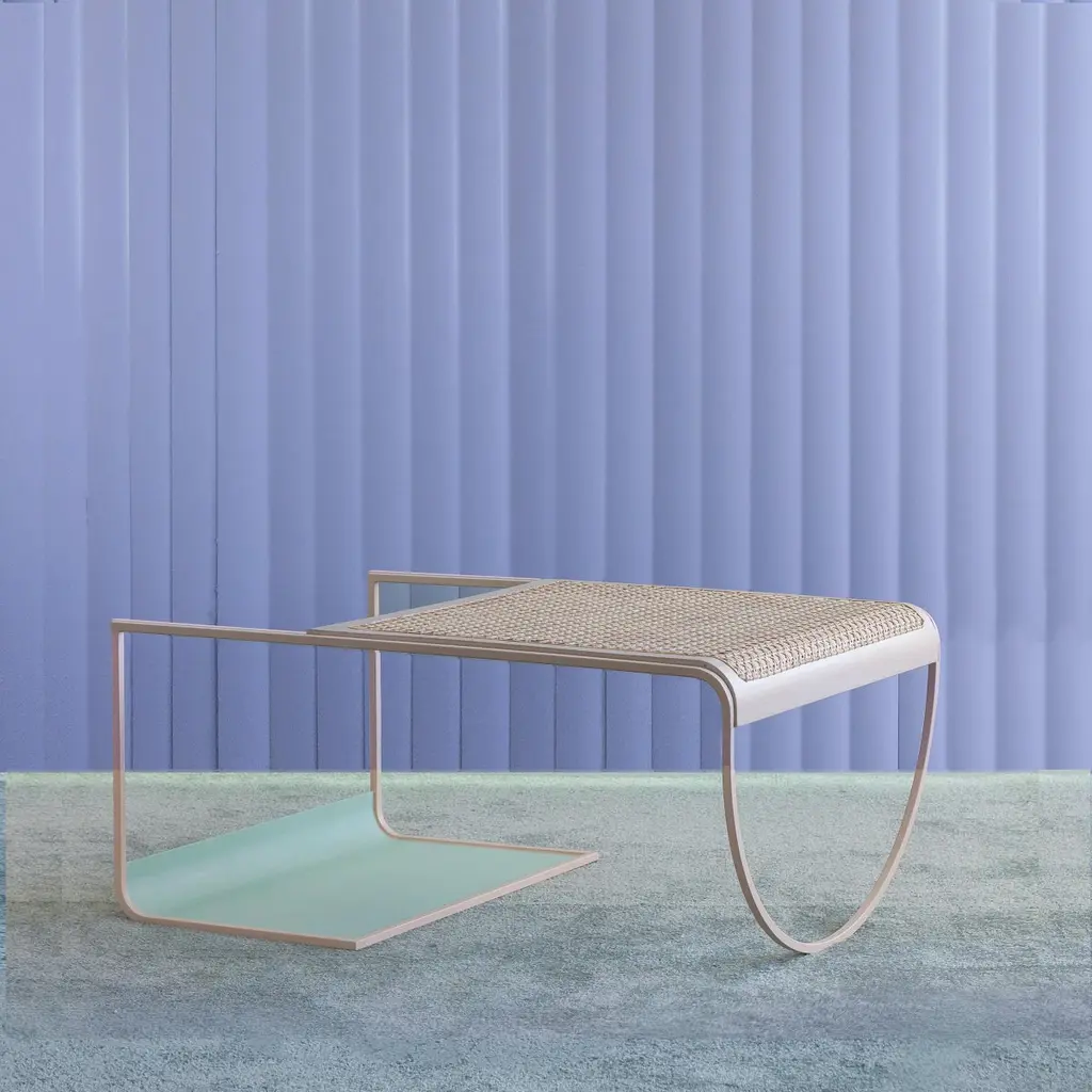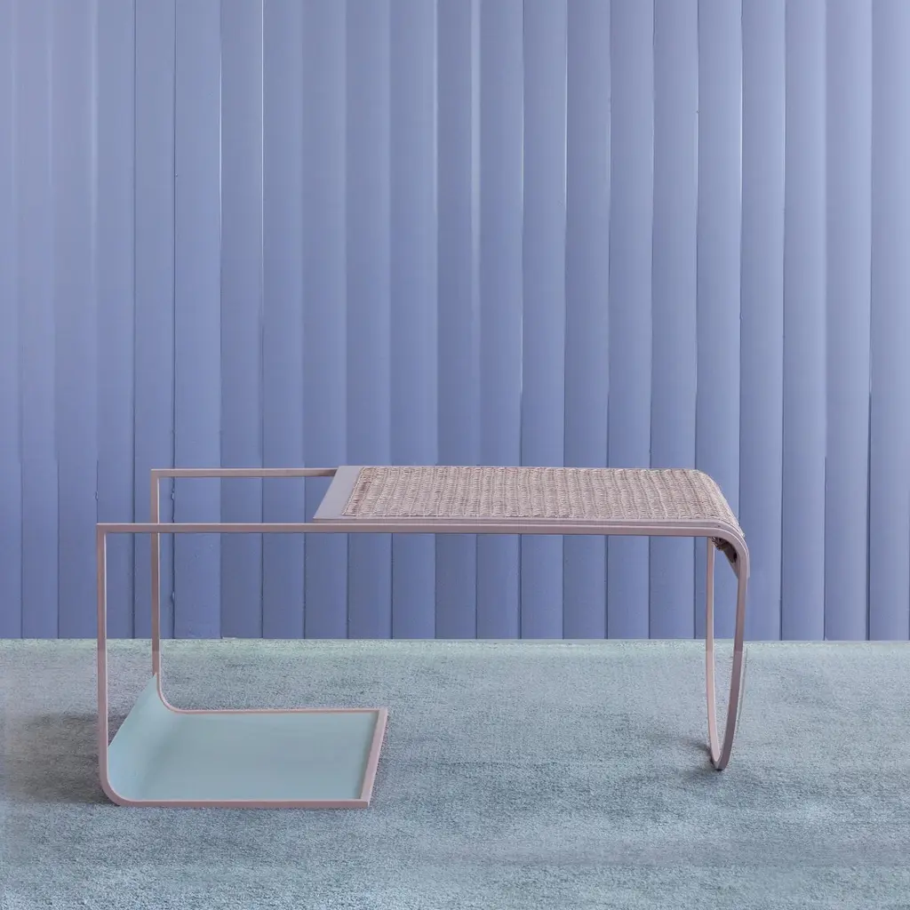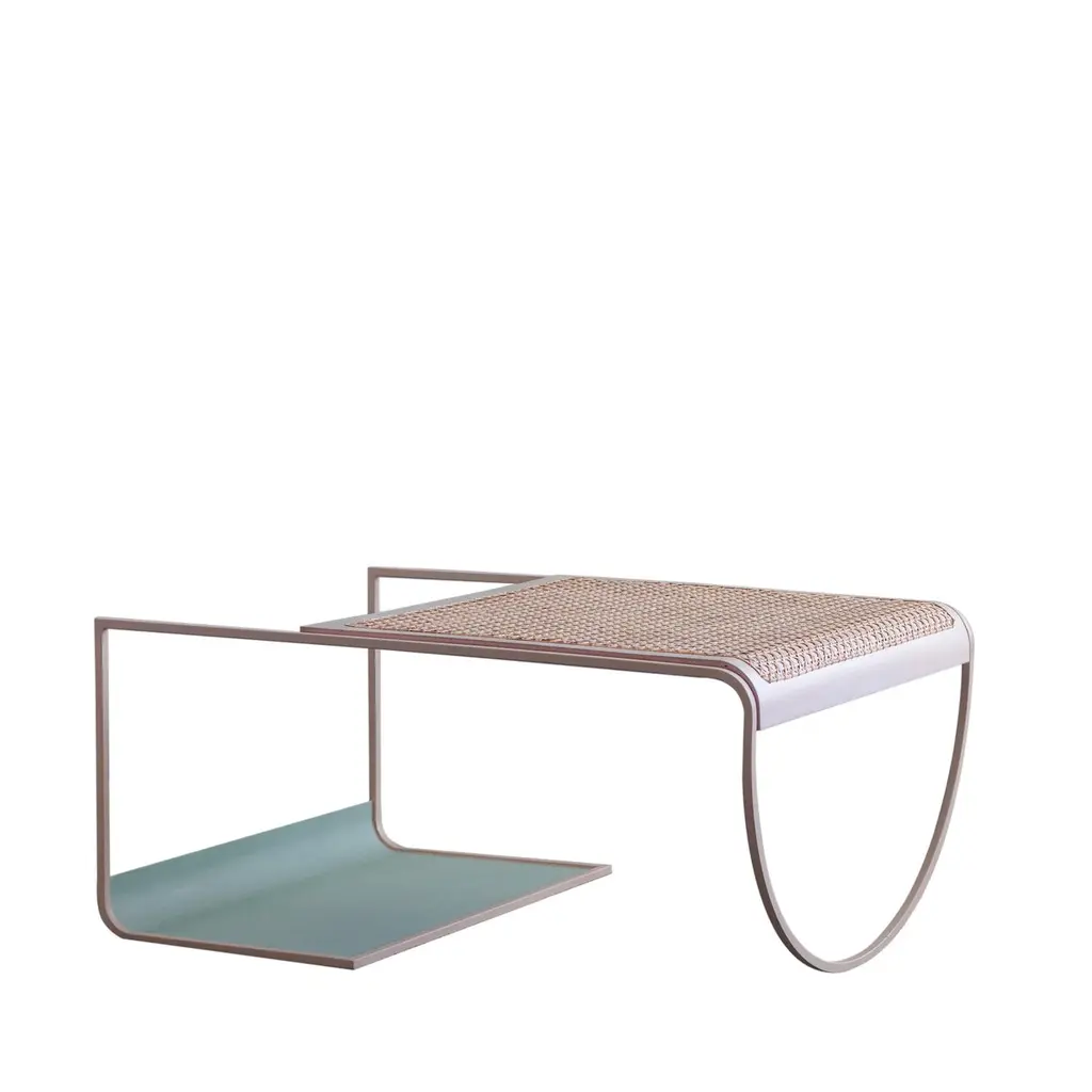 Cane SW coffee table by soft-geometryMaterials: Steel, handwoven caneDimensions: 36 x 24.5 x 17” H Simple, playful geometries form the light and fluid sw cane coffee table. The table perched on an arched-belly base on one side and a rolled rack for storage on the other, offers moments of surprise in its subtle reveals of form and color. The Minimalist steel frame is dressed with a handwoven cane top, that uses a traditional six-way cane weaving technique from India. Soft-geometry is an Indian design studio creating collectible furniture and home objects around a central theme of softness. Inspired by the rich, diverse object culture and craft-traditions of India, their objects are predominantly hand-made, bridging traditional and modern ways of making and seeing. Based in Kochi, India. "Softness is a degree, almost anything can be plotted along a soft-hard axis. There are soft materials - soft velvet, fur, felt, hair, wool and any others that are soft to touch. There are visual associations - pastel colors, billowy clouds, things without edges and the soft light of dawn or dusk. There are soft sounds - whispers, melodies, the rustle of leaves; and soft scents - the smell of rain, wet ground or faint perfume. More interestingly still, softness can be abstract - it is malleability, a willingness to learn or change, fluidity, humility, empathy, slowness, childlike innocence or imperfection."