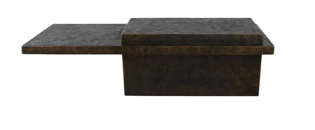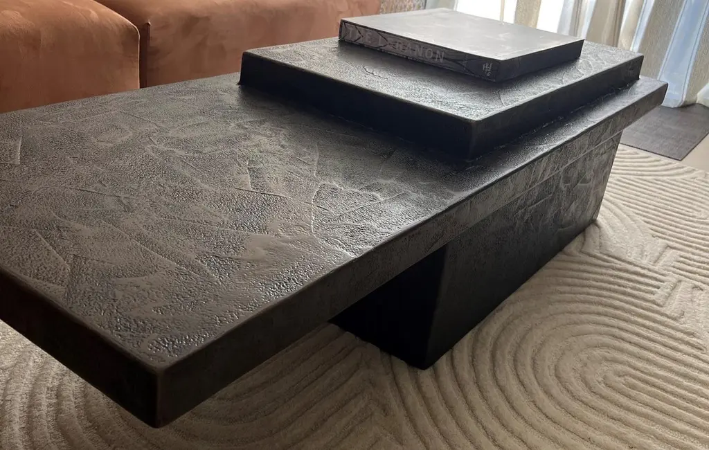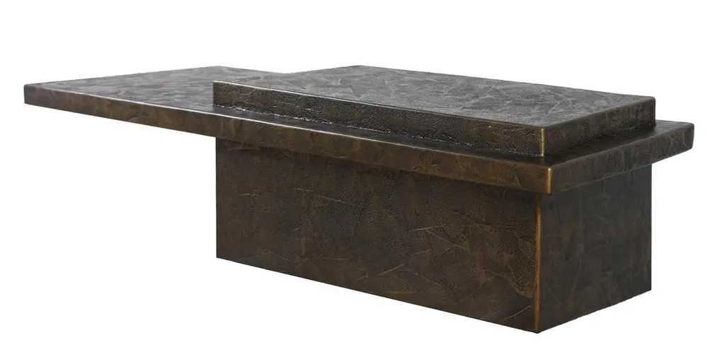 This handcrafted coffee table is crafted from a composite blend of wood, resin, and fiberglass, it features a distinctive design inspired by the raw and unadorned aesthetics of the brutalist school of design. Drawing inspiration from the robust forms of levers and cranes, this coffee table boasts a unique architectural presence.Its bronze finish is achieved through a painstaking hand-application of a special coating and paintbrush texture technique. The result is not only visually striking but also highly durable, rendering the table pet-proof, and impervious to scratches, stains, and water damage.For added safety, the table's edges are rounded and smoothed. What sets this coffee table apart is its ability to be fully customized to suit your space, with options for size and finish tailored to your preferences. intended to serve as an indication. Various factors, such as the ambient light during photography, viewing angle, and calibration of your screen, can alter the perceived appearance. Additionally, since these are handmade products, each piece is unique, and it may be challenging to capture the intricate details of the materials used in every image.