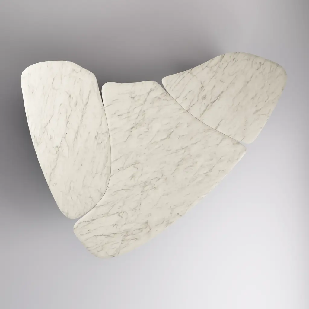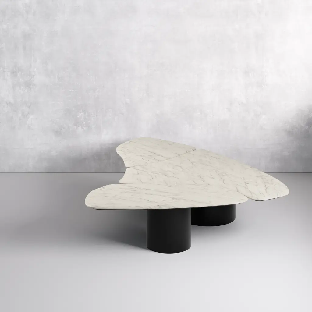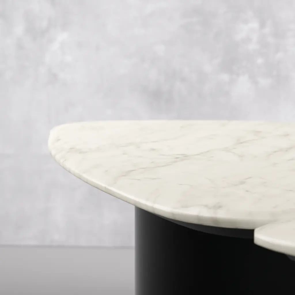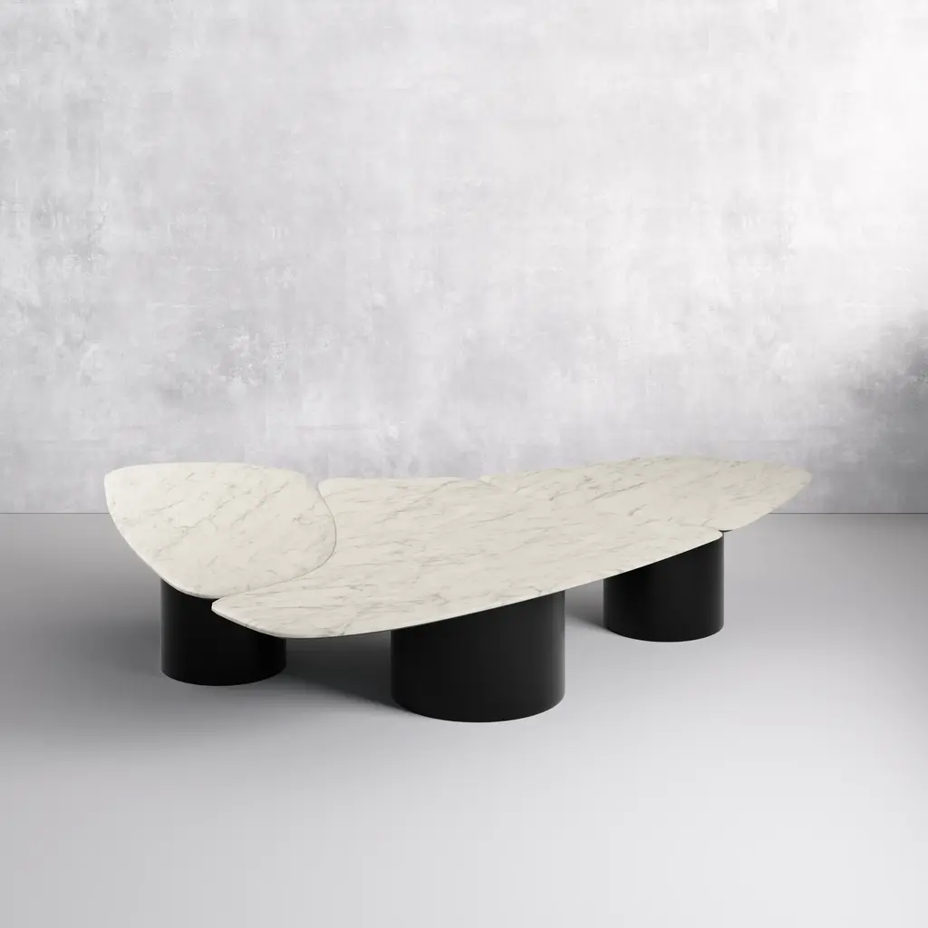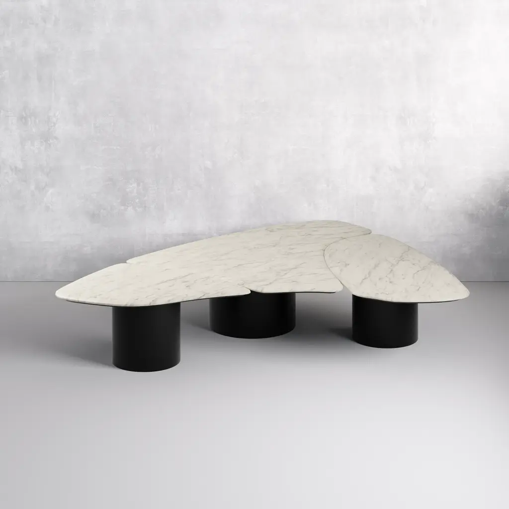 The cylindrical iron base elevates a sturdy marble top. This avant-garde surface is one unit of our three-piece Capri coffee table set. If you love asymmetry, you'll be captivated by the eclectic elegance of this piece. Make a statement without sacrificing style. This three-piece set will act as a stunning centerpiece in your living space. Dimensions: 79W x 15H x 63D Tear Sheet