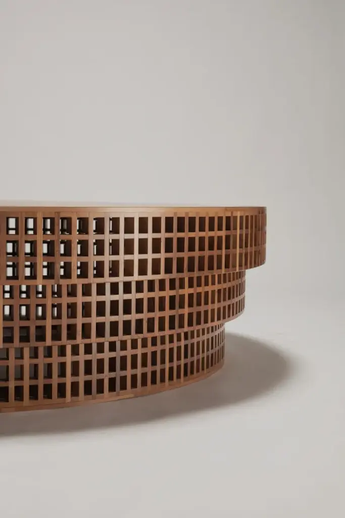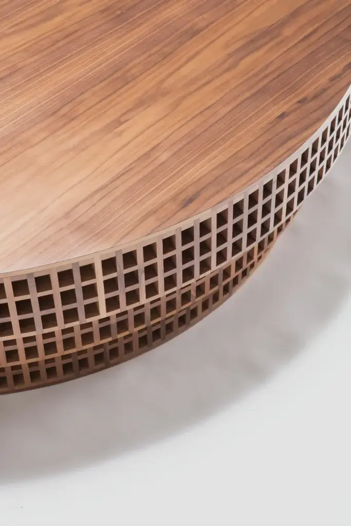 Carabottino is a round low table in solid wood.MATERIALScanaletto walnut, basswood, mirrorA wooden lattice that is presented in a two dimensional form traditionally made of wooden strips, is considered an accessory element of relative importance, a bit like a window frame, it is not perceived as an object in itself, as no grating objects or grills become objects. Its graphic appearance, a consequence of the construction logic, makes it recognizable and punctuated by vertical and horizontal intersections, the play of solids and voids, of images that overlap and that are filtered through their texture makes them vibrant as if they were moving pictures.