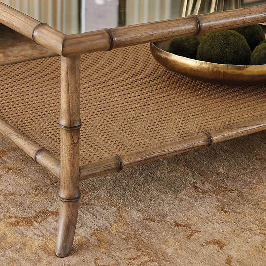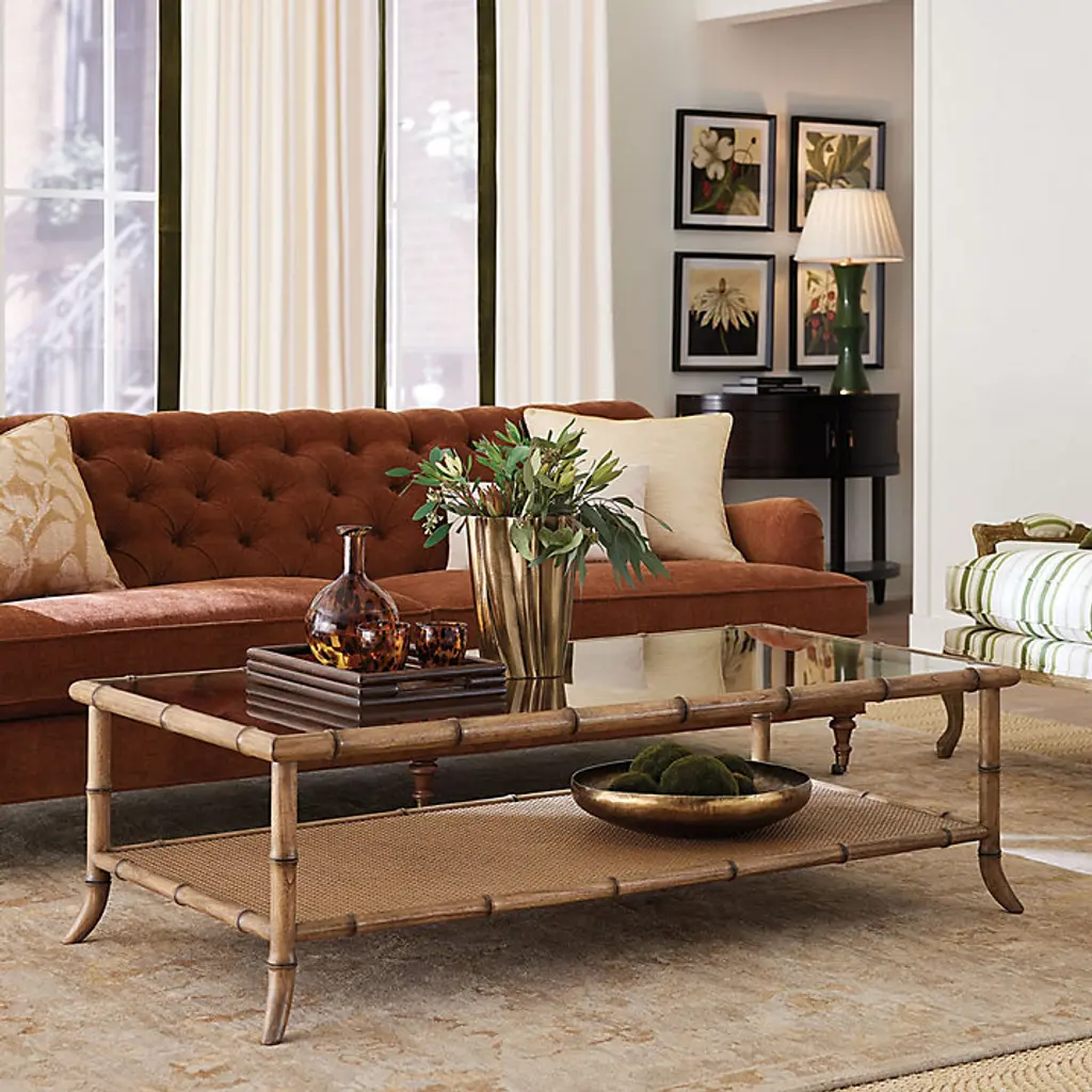 With its perfect proportions and bamboo-inspired silhouette, our glass-top Caris Coffee Table serves a living room sectional or family room sofa with relaxed global style. The frame is crafted of hardwood and hand carved to capture the warmth and texture of natural bamboo. The lower shelf is covered in a seamless sheet of tightly woven rattan peel over wood, creating a richly textured space for displaying prized ceramics, books, and collections. Caris Coffee Table features: