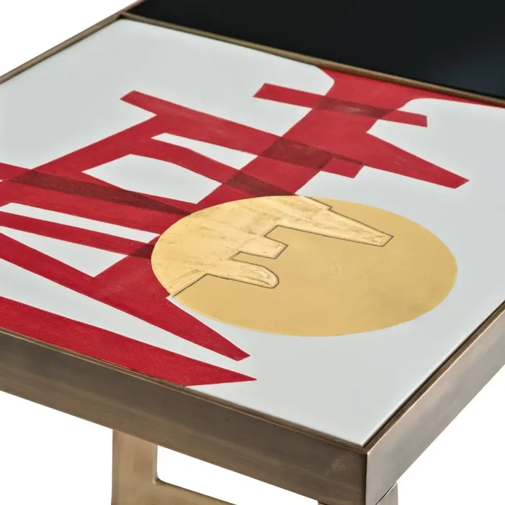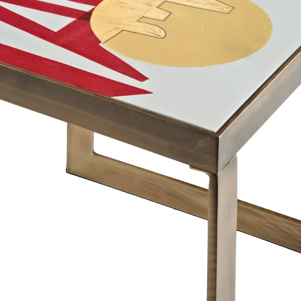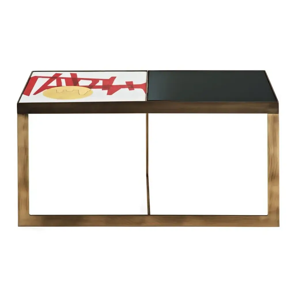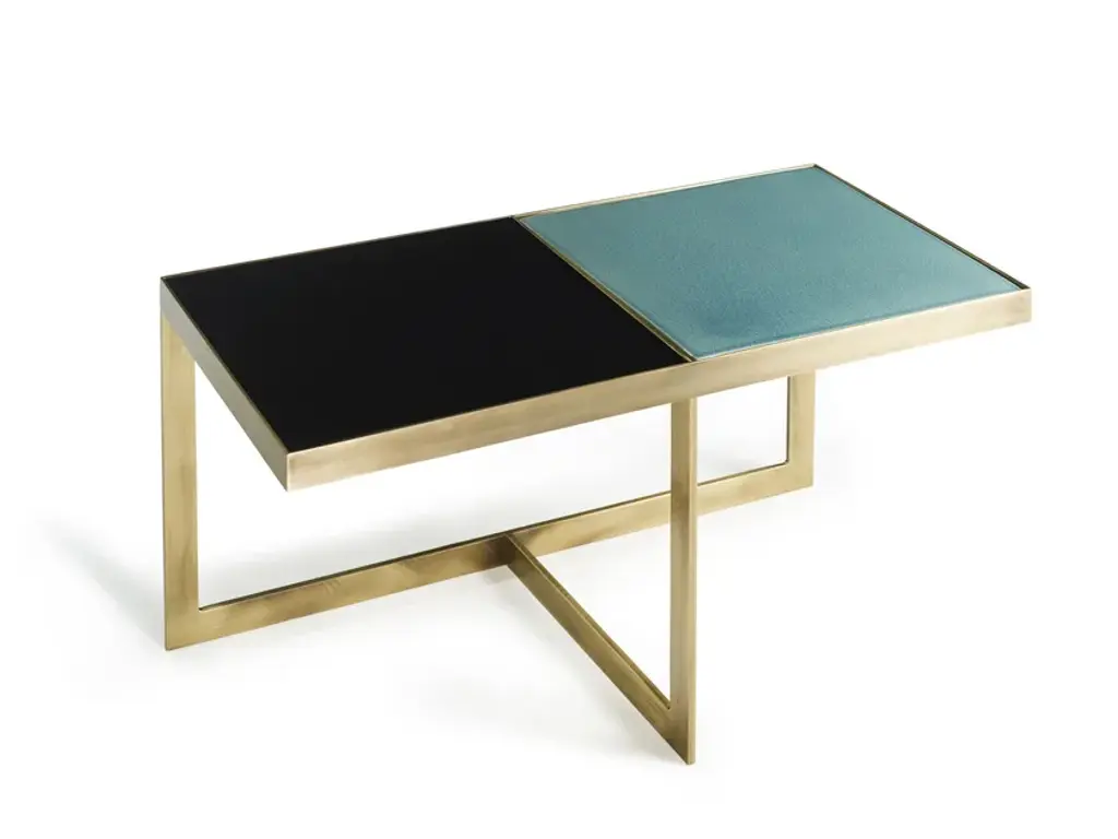 Coffee table h.45 cm with brass structure and glazed ceramic/painted glass elements recessed top. Available in different combination of materials.